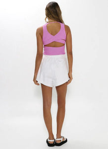 Discover the alluring beauty of this form fitted, high necked top designed with a cutout feature and constructed with a luxurious stretch knit texture.
