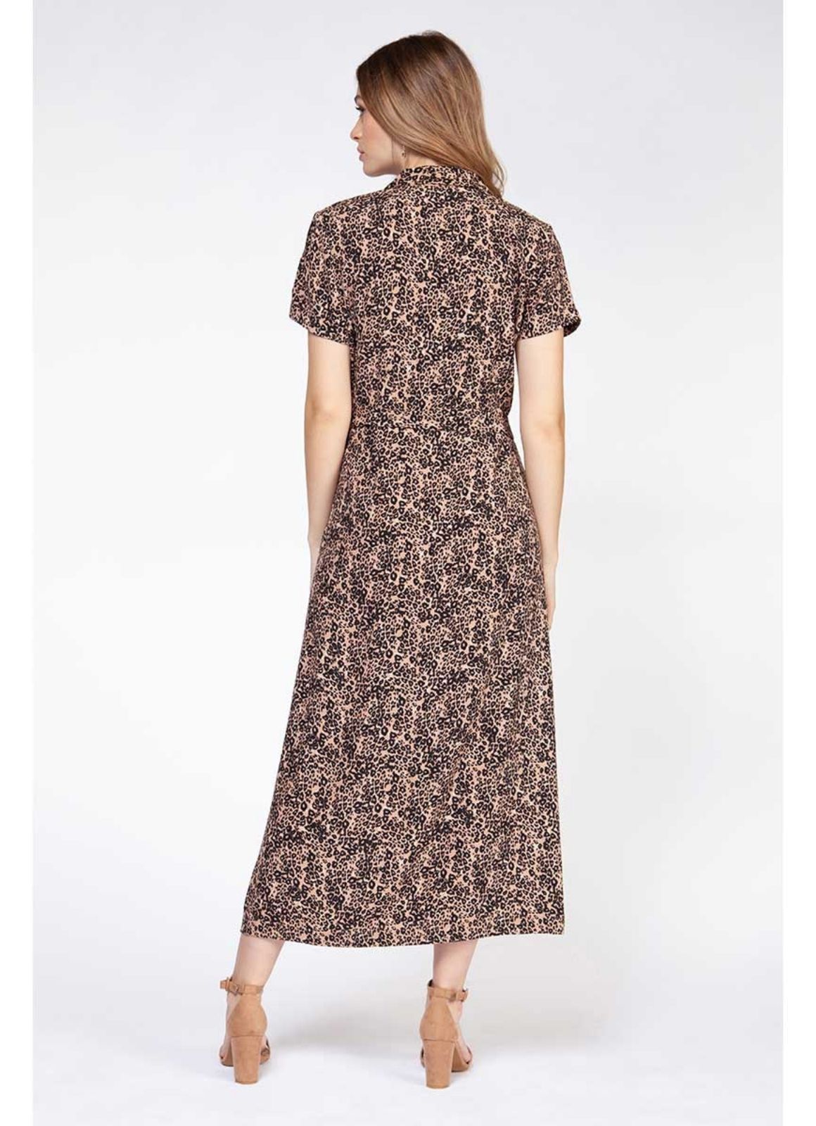 Rawr. You look good. This classic dress style gets a modern update in a nude leopard print. Features front button closures and a tie belt.