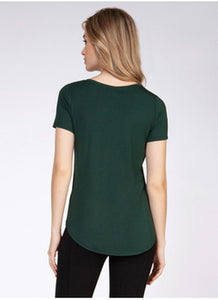 This deep emerald gets top drawer treatment. V neckline, short sleeve tee.