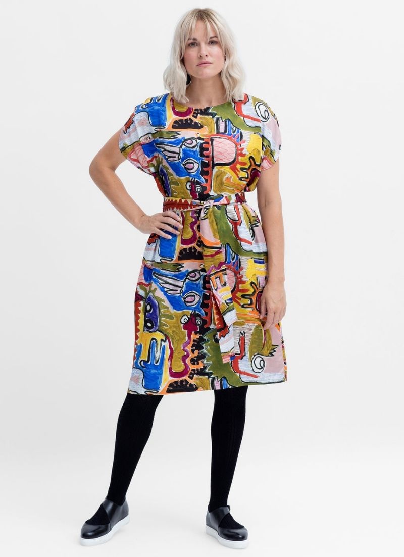 The Mostro Dress is a fun and vibrant tunic style dress in a print designed by UK artist Brittany Porter. This dress is an easy, throw on style with luxurious details such as French seams and a self tie fabric belt to cinch in at the waist with handy side pockets for enhanced functionality.