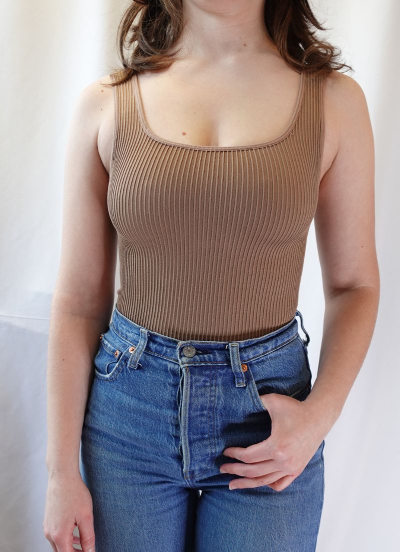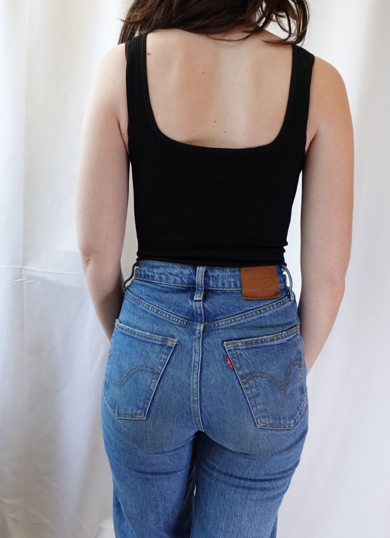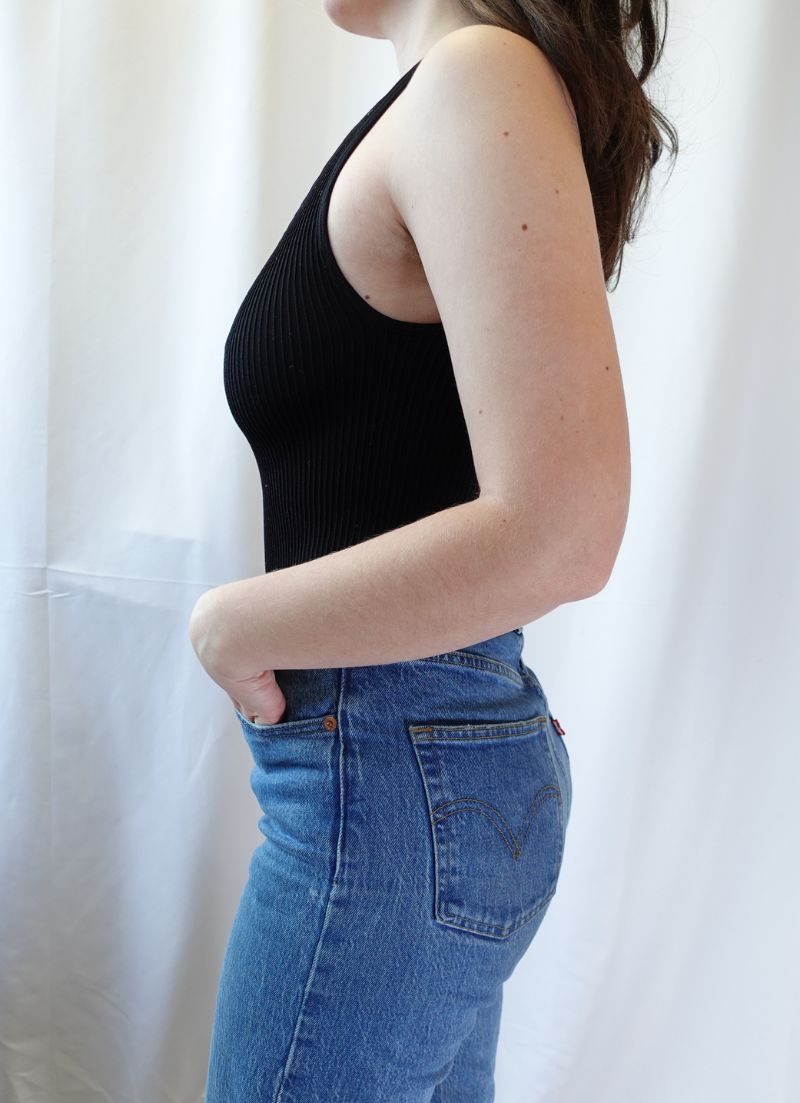 The Emma is a ribbed bodysuit, it features a flatering neckline and two snap buttons closure.