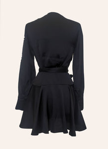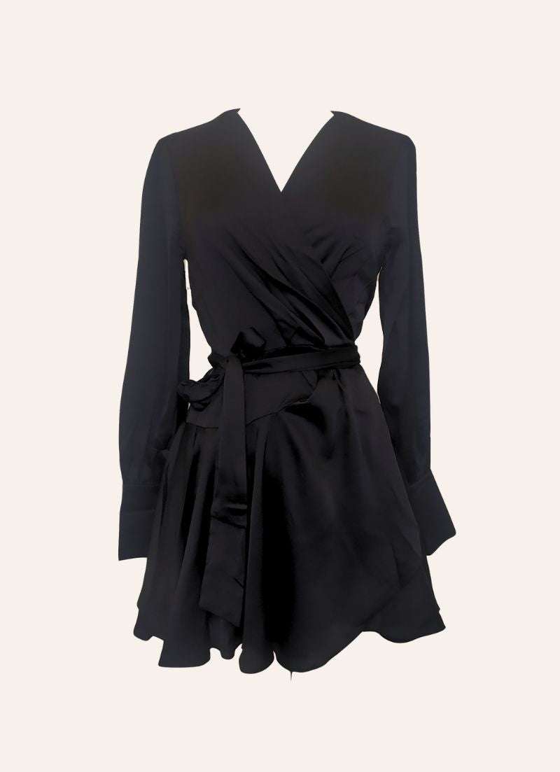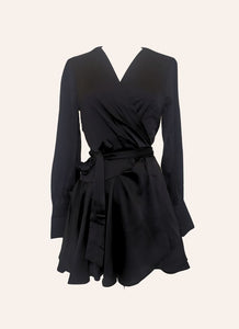 The Emma Mini Satin Wrap Dress features a wrap front silhouette, blouson sleeves with elongated cuffs and ruffled mini skirt. The Emma dress is elegant and will be your perfect Little Black Dress for any event.