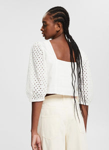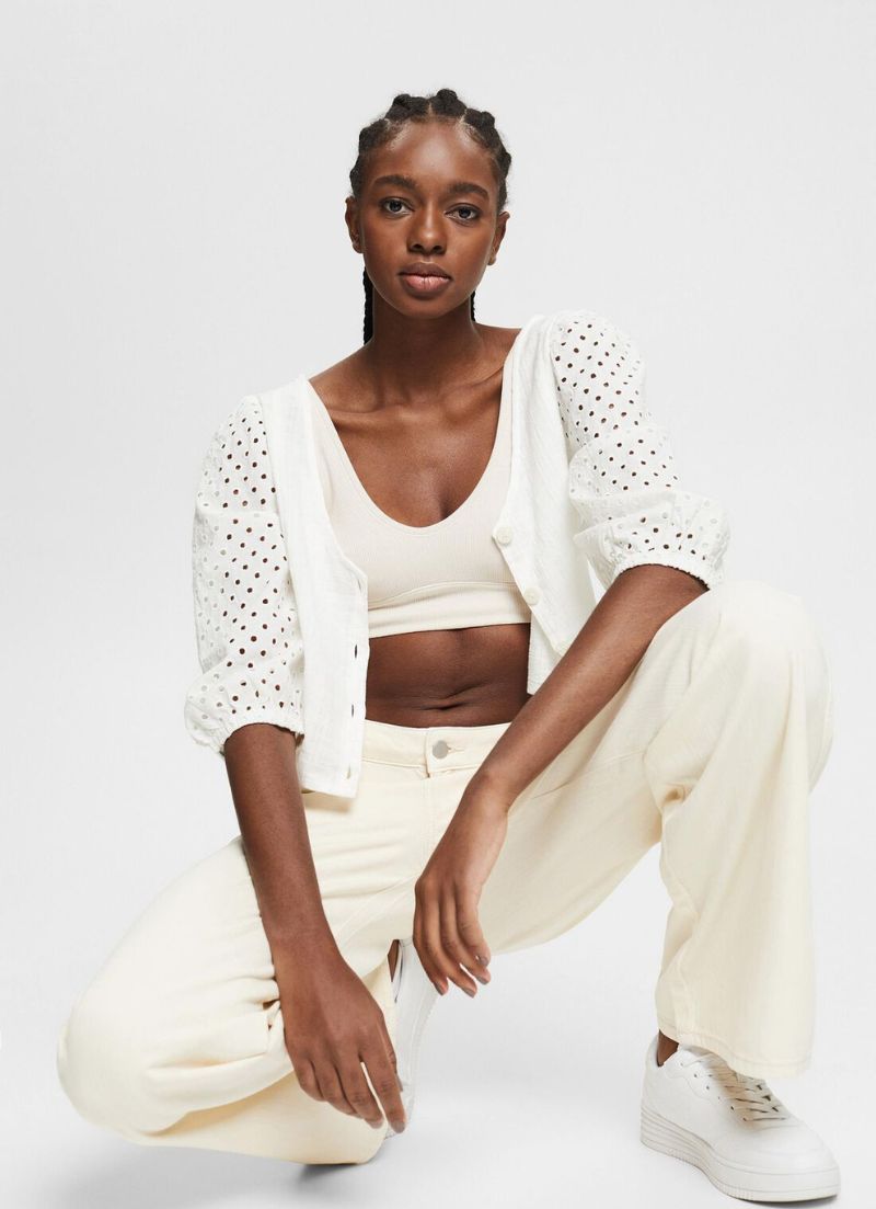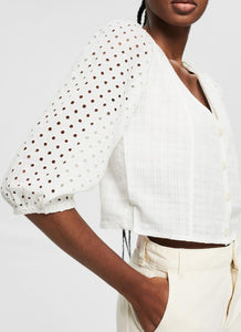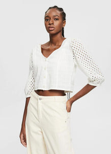 This cropped top with wide sleeves featuring broderie anglaise and a deep V-neckline is a perfect example of the trendy boho look.