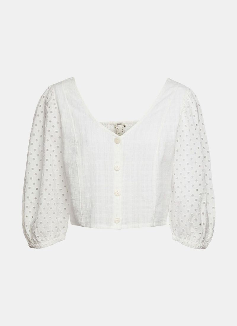 Wide 3/4-length sleeves with broderie anglaise and elasticated cuffs