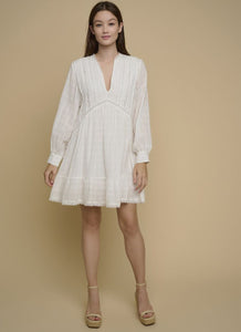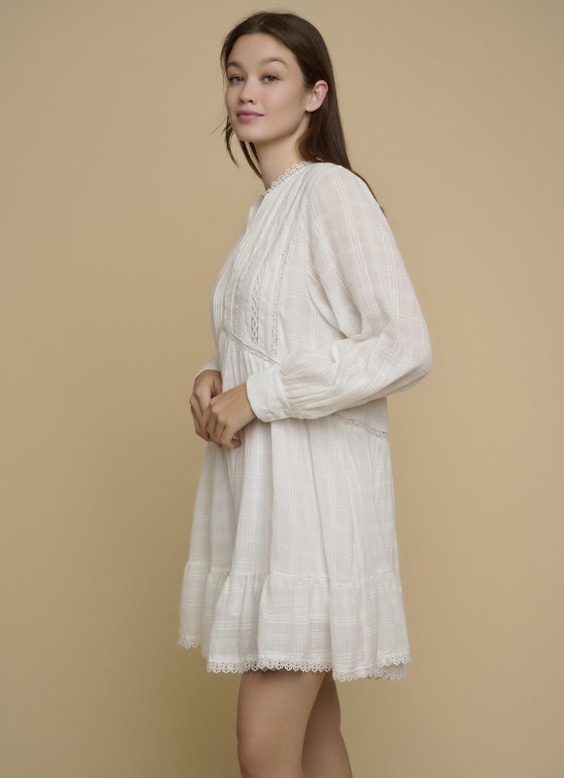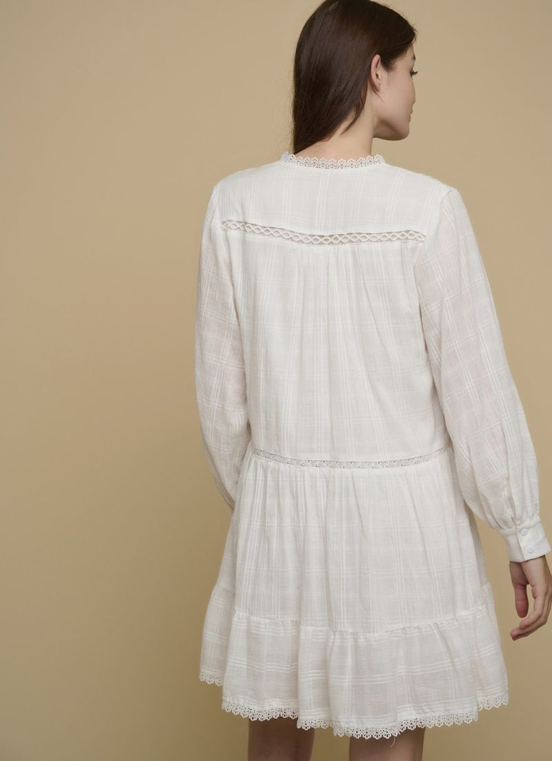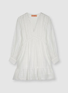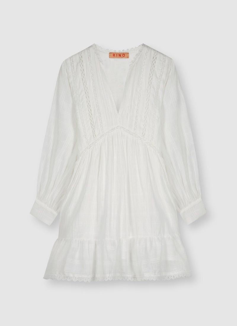 Romantic dress with lace details. This summery dress features a v-neck a wide fit and ruffled details at the bottom. Perfect for a romantic day or night out.