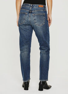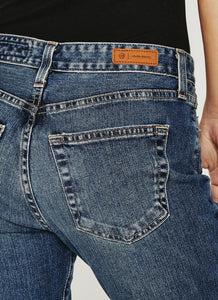 The Ex-Boyfriend jean for women features a medium indigo wash with a 14-year fade and worn hems. This style has a flattering high-rise waist and a slouchy, relaxed fit from hip to knee before slightly tapering at the leg opening for a slimming effect.