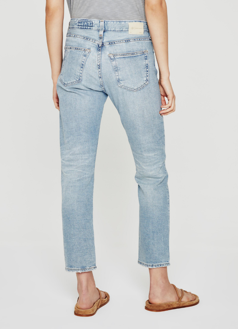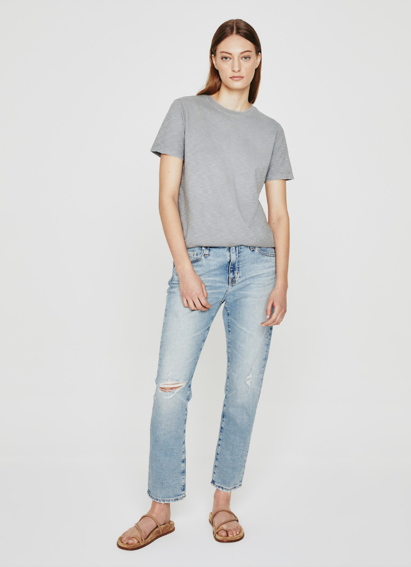 The Ex-Boyfriend Slim Jean has destruction at the knees, and gently worn hems. These jeans feature a flattering high-rise waist, the style fits slouchy and relaxed from hip to knee before slightly tapering at the leg opening for a slim finish.