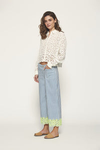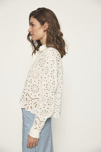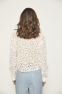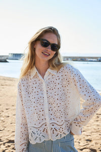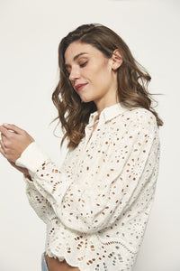 Elevate your wardrobe with our Eyelet Blouse! This long-sleeved shirt is made of 100% cotton, providing comfort and breathability. The delicate perforated design adds a touch of elegance, while the button-front closure and wave-trimmed hem make it versatile for any occasion. Perfect for the modern woman who values style and comfort.