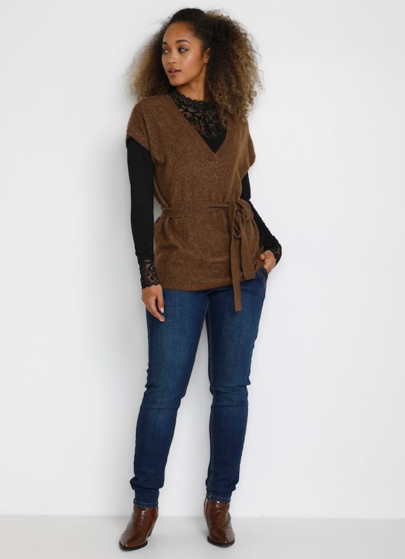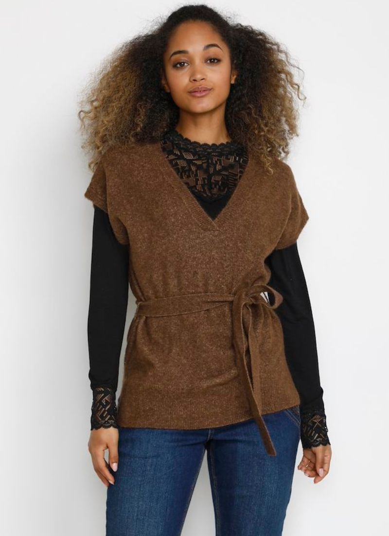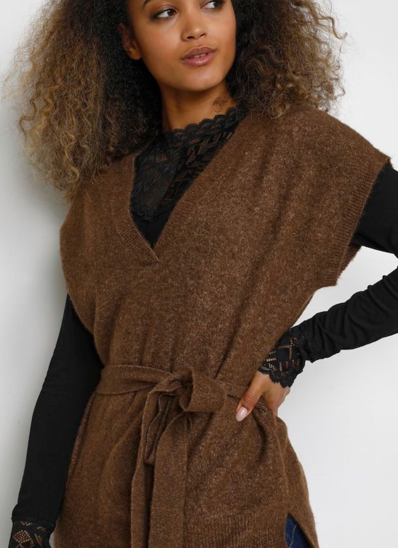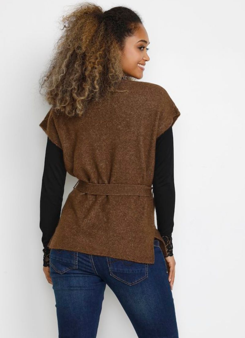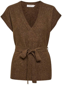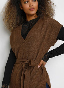 The Fairy Knit Waistcoat is a knitted vest with a deep V neckline and a waist belt.