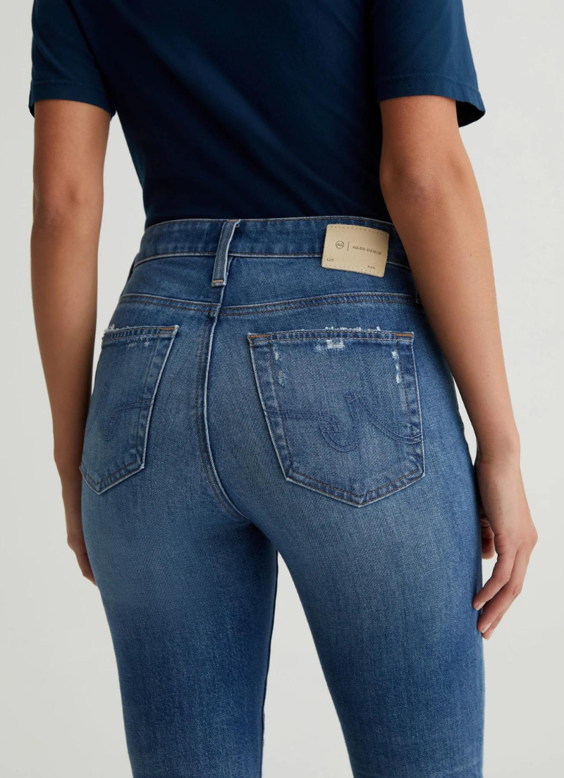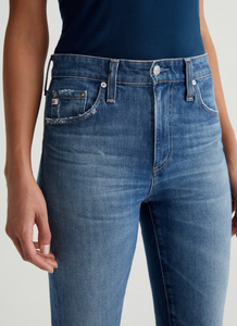 The Farrah Boot Crop features a high-rise bootcut silhouette in a cropped length. Crafted from stretch-blend 11 oz. Journey Denim, these women's bootcut jeans have a medium blue wash with fading, whiskering, and touches of distressing at the pockets and hems. The pair sits high on the waist and has a skinny fit through the legs before opening into subtly flared shape. The model is wearing a size 25.