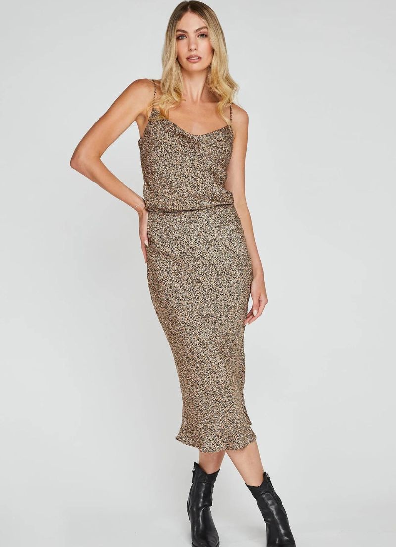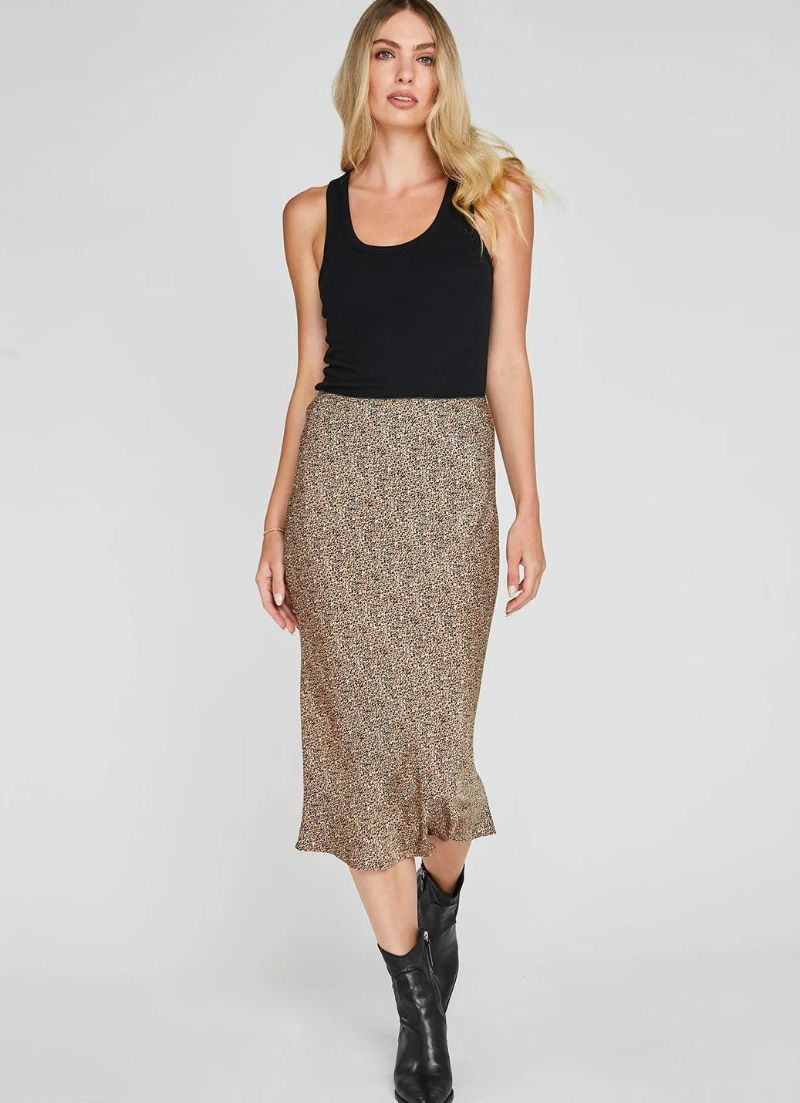 The Florentine Skirt is made of satin fabric with a print designed in house at Gentle Fawn. The skirt is bias cut for a flattering fit and features an elastic waistband with delicate scallop trim along the top edge.
