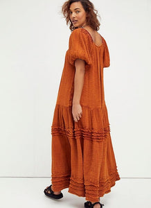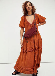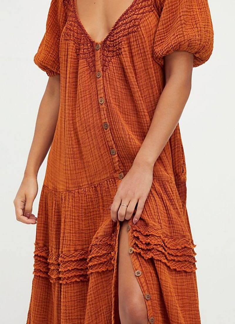 The perfect one-and-done addition to your day off, this sweet button-front maxi features a wide, embroidery-adorned v-neckline with puff sleeves and longline skirt with layered pleated detailing.