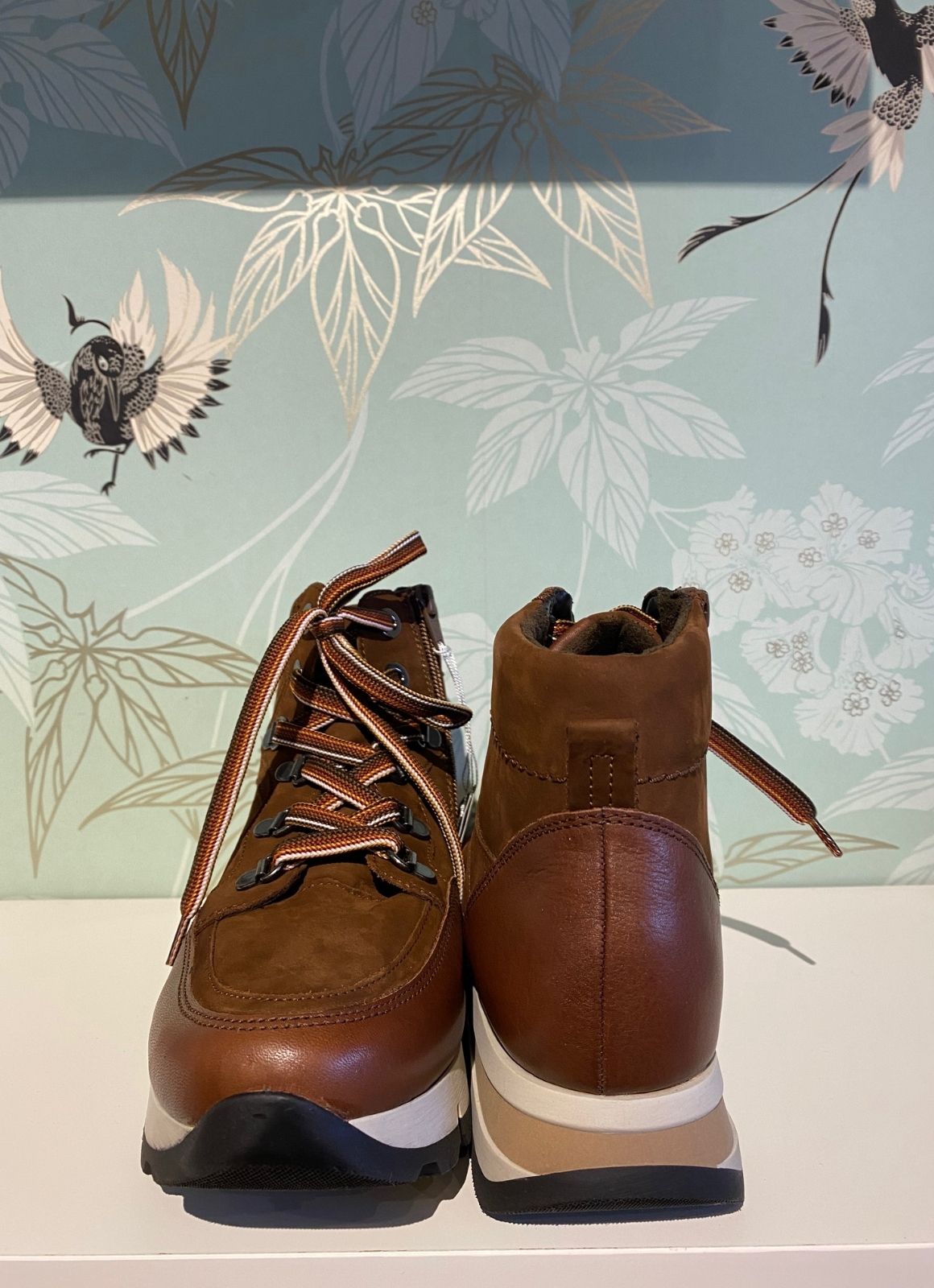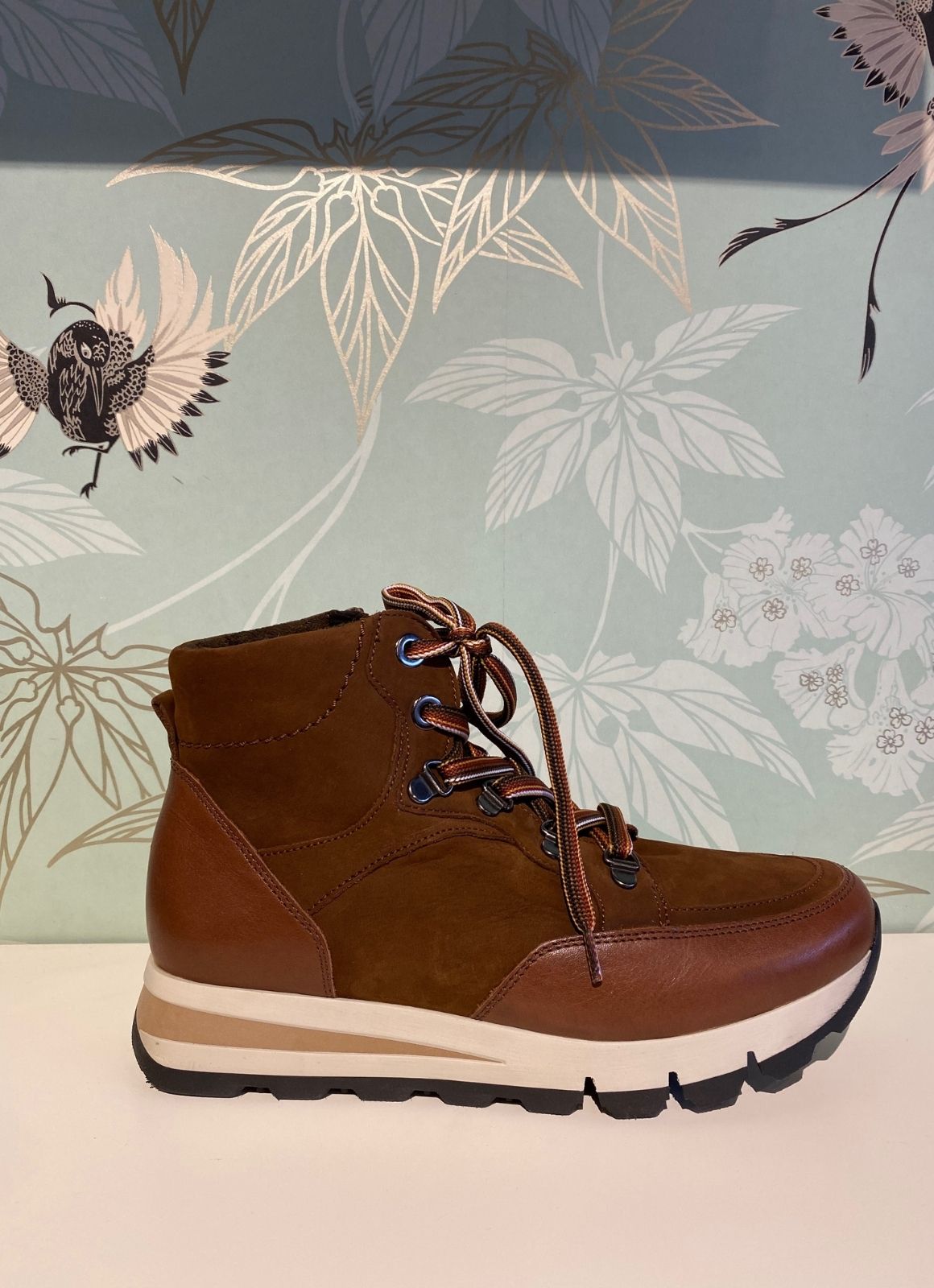 Cognac-brown Gabor lace up sneaker boots. Features a nice thick contrasting sole. Comfortable with width for the toes so don't forget your warm socks!