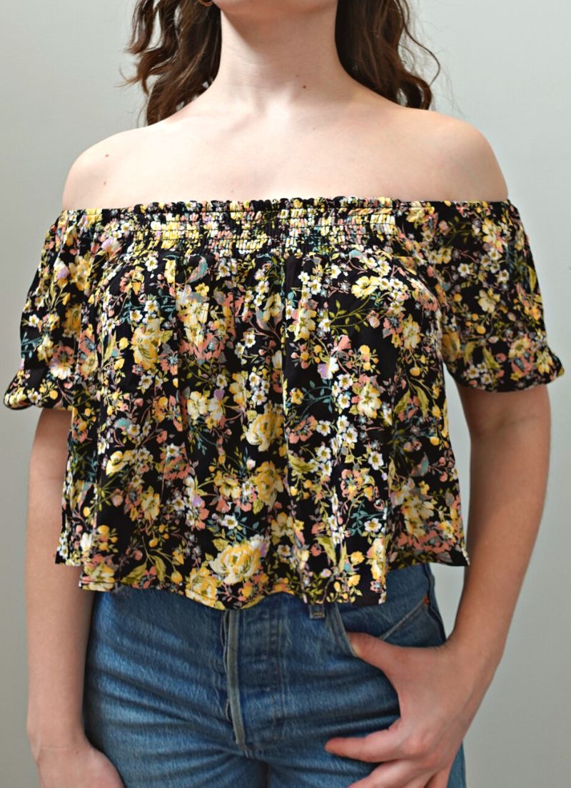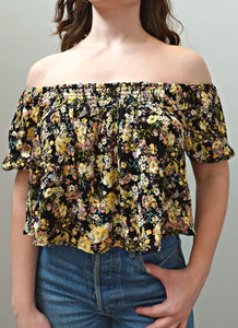 The Get Away Garden is a off-the-shoulder blouse featuring short puff sleeves.