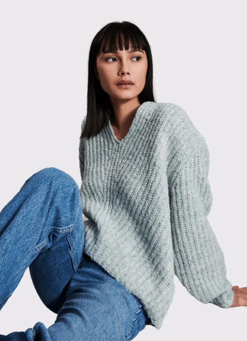 Line's Grace v-neck is crafted in a fluffy textured yarn and features a relaxed silhouette, directional contrast rib detailing, drop shoulder and a flattering open neckline.