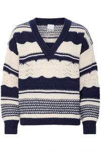 Get ready to snuggle up in the Hastra Crewneck Sweater! With a trendy v-neck design and a navy and cream pattern, this knit sweater is both stylish and comfy. Stay warm and fashionable on those chilly days with this cozy piece.