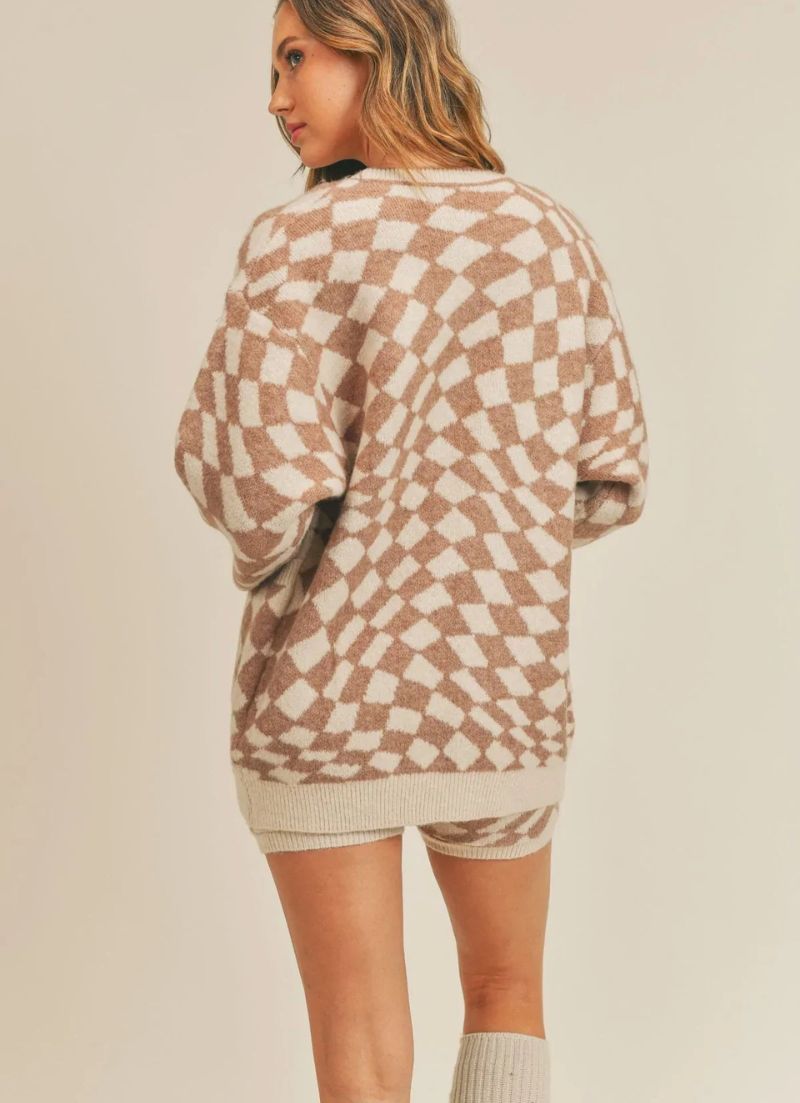 An open front cardigan in a diamond print. Features open pockets and striped trim details. The Heart Of Joy Cardi is super cosy and looks great with a basic layering top underneath.