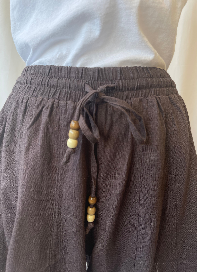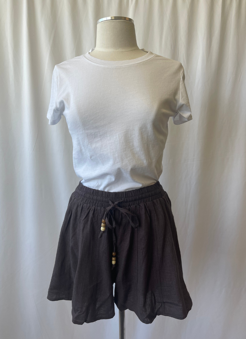 Breezy boho skort with a drawstring featuring bead detailing as well as an inner and outer lining for a better shape.