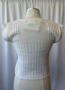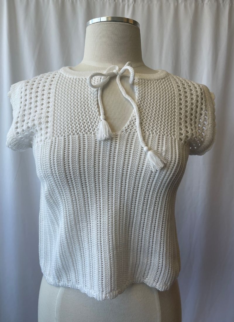 This sweet tank features a drawstring at the collar and is very slightly cropped. Pair with a pair of denim jeans and flats with a pop of colour.