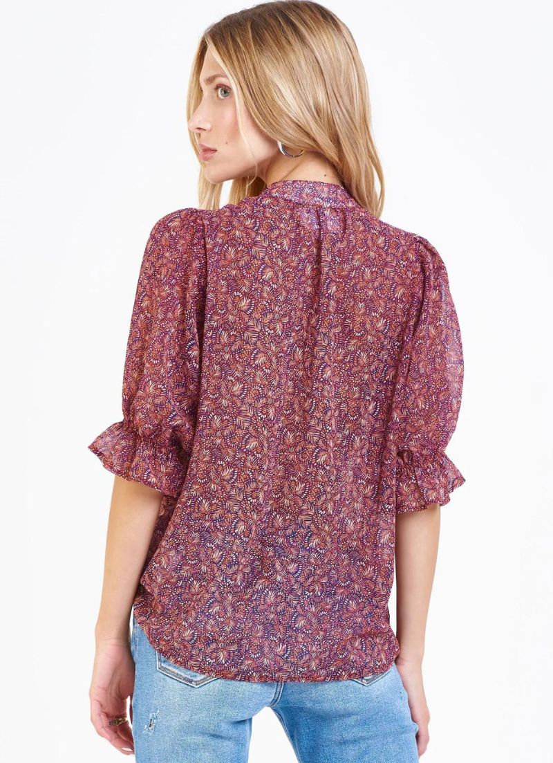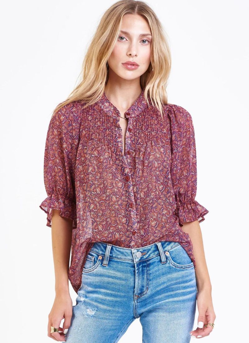 Button front shirt, shirred shoulder & yoke, puffed sleeve with ruffle cuffs & mandarin collar finished in contemporary palm print. Eternal palm showcasing life's vitality, always inspired & living at your fullest! Multi print woven on relaxed fit.