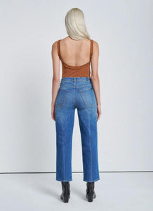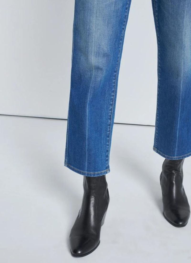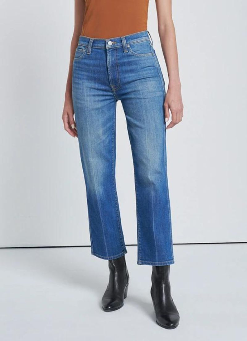 Take it easy in the cropped version of a straight leg jean. Done from comfort stretch denim for all- ay wear in a medium wash, this high-rise style suits desk to dinner looks that suit your lifestyle. Top with a chunky knit and a pair of boots.