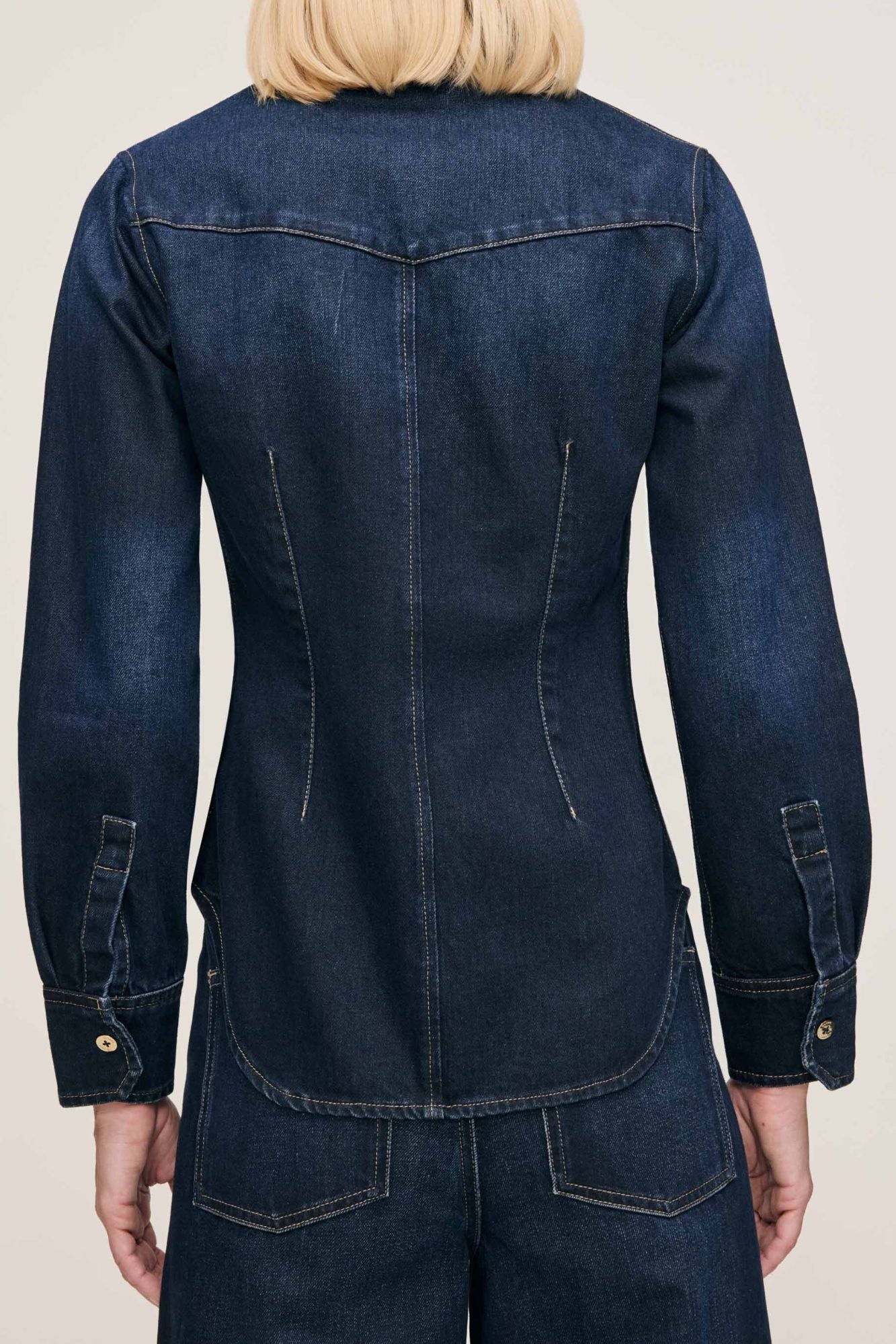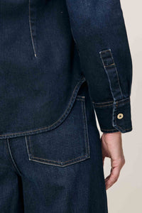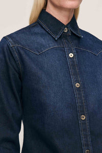 Elevate your everyday wardrobe with the Ines Shirt, a timeless tailored button-down that effortlessly transitions from office to weekend. The crisp point collar and gently rounded hem create a polished silhouette that flatters every frame. Pair it with the Ventura dark rinse denim—featuring sophisticated gold hardware, tonal stitching, and impeccable finishing—for an instantly refined look that works harder than you do.