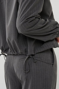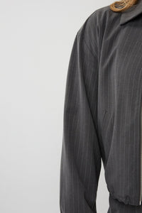 This lightweight bomber jacket features a classic collar and subtle pinstripes, designed to hit at the waist for a polished silhouette. Perfect for a coordinated look, pair it with matching pinstripe pants to elevate your style effortlessly. Ideal for those seeking a sharp, comfortable layer that transitions seamlessly from day to night.