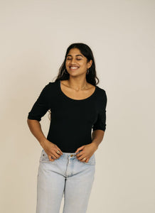 This is your new, go-to body suit! Designed with a beautiful scoop neckline and a loose-fitting sleeve that hits just above the elbow, this bodysuit is as classic as they come. Crafted with our signature modal fabric that has just the right amount of stretch. Finished with snap closure and full bottom coverage.