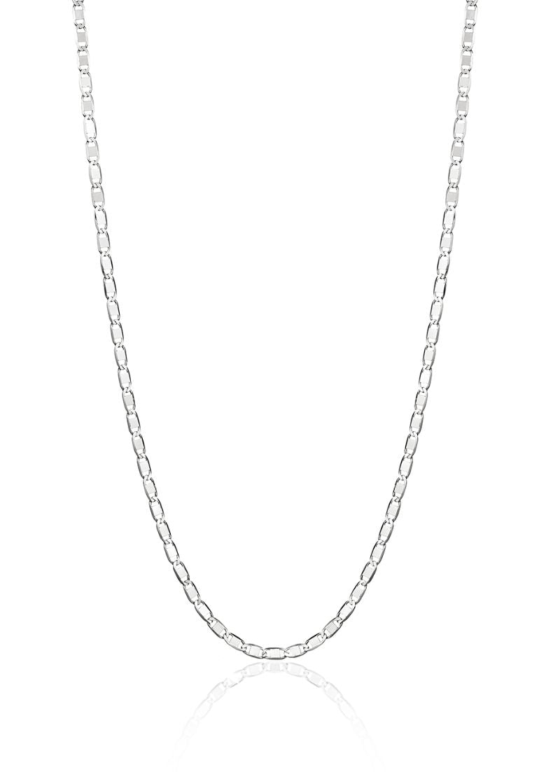 A custom, flattened mariner chain. Finished with a lobster clasp closure and stamped logo. Dipped in silver and finished in a high polish.