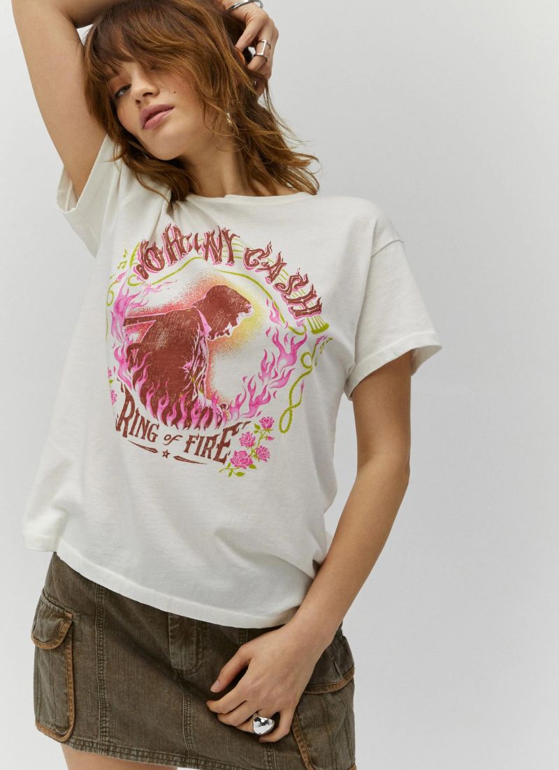 Introducing the ultimate tribute to the Man in Black himself. One of Johnny Cash’s most iconic songs, “Ring of Fire". Made from a heavier loose knit cotton jersey, the tour tee features an open feminine neckline and ultra flattering draped sleeve. With a length that shows off all your assets.