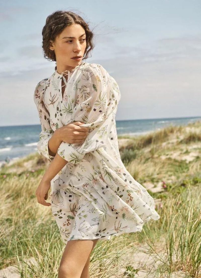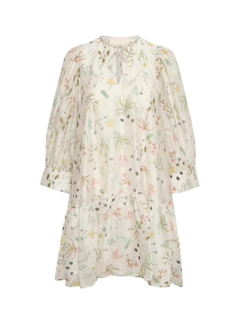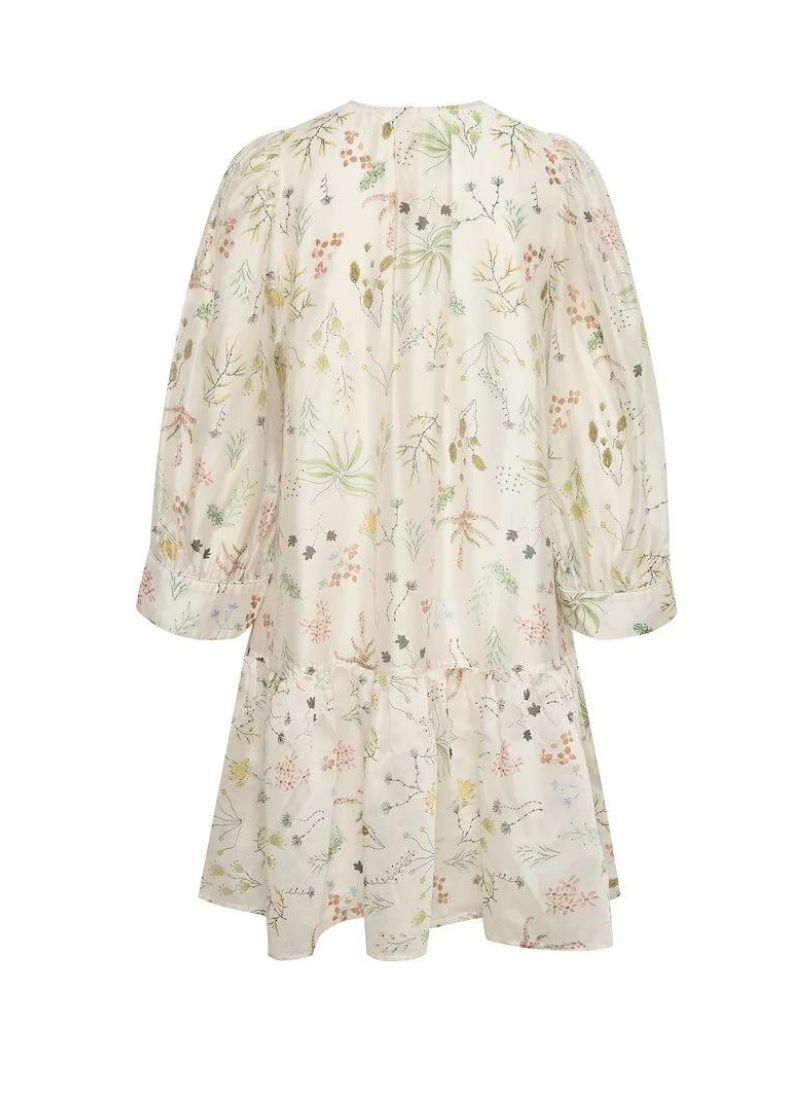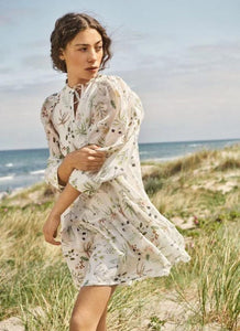 The Keya Dress is made in a beautiful, flowy and oversized fit. Featuring a tie up neckline, 3/4 length sleeves and a spring print all over.