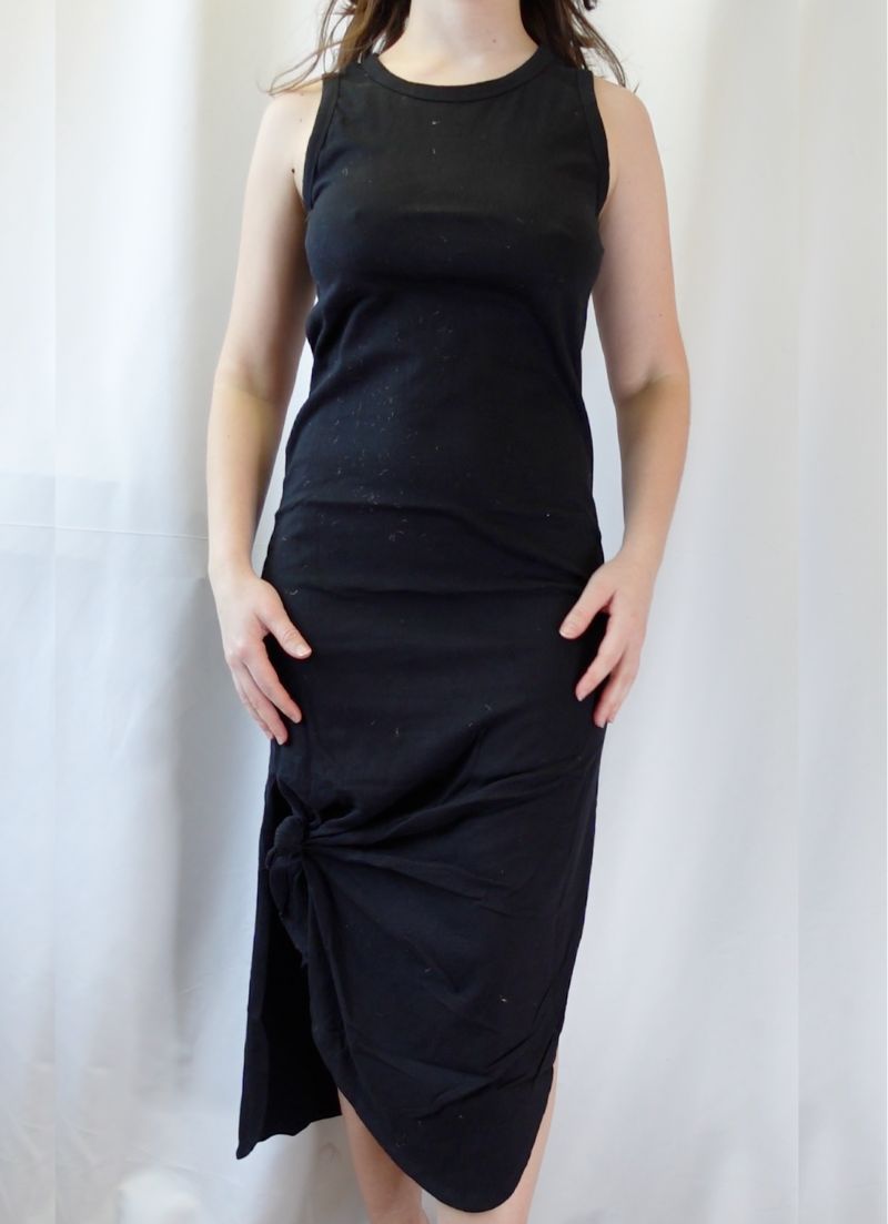 The Kiki is a long sleeveless dress with a knot detail at the knee and two side slits.