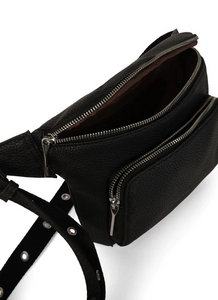 Belt bag with a zippered main compartment and a front zip pocket. Buckle belt strap for comfortable wear around the waist or across the chest. The front pocket can fit a large smartphone.
