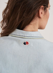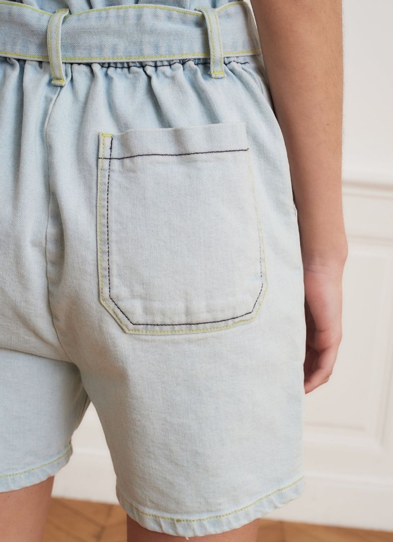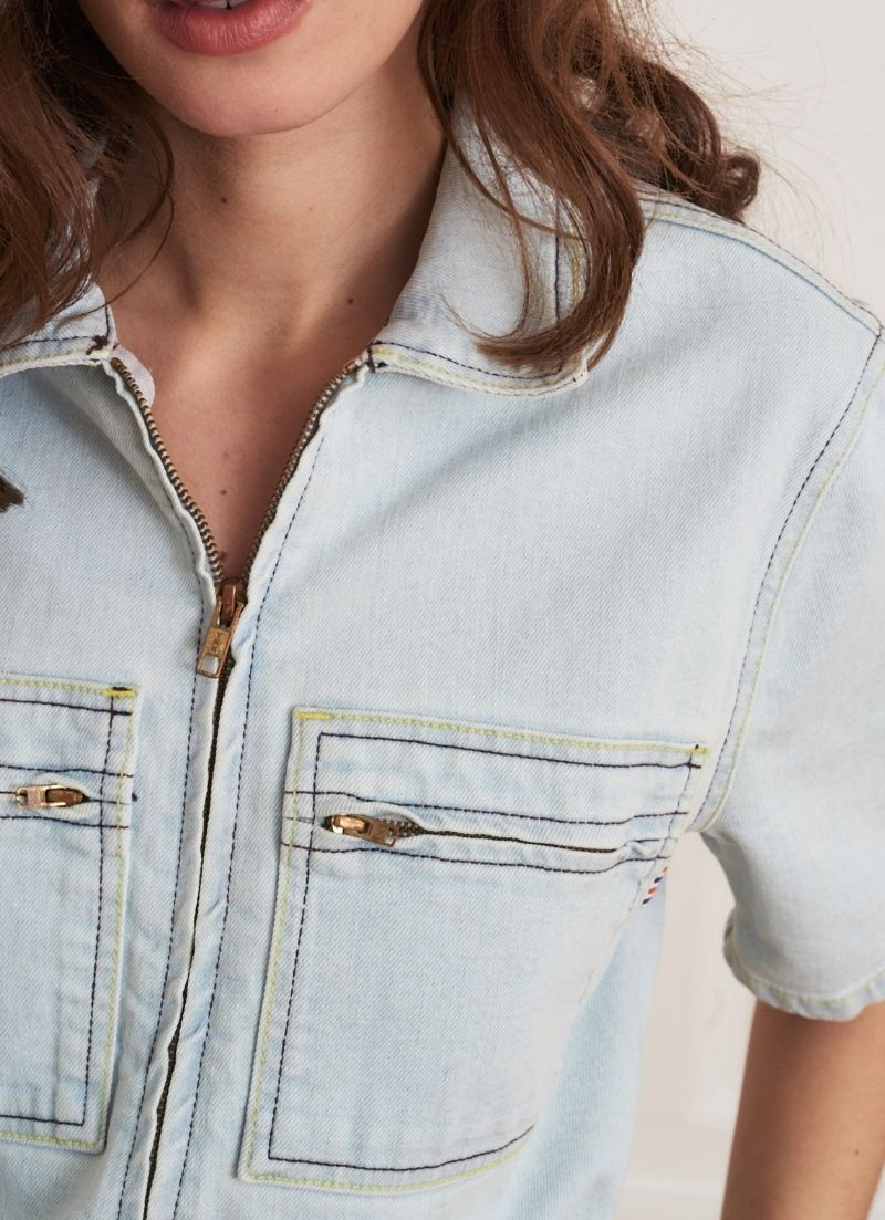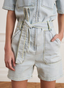 The Capucine Romper is a denim playsuit featuring a belt to tie at the waist, pockets with zip on the chest and side pockets.