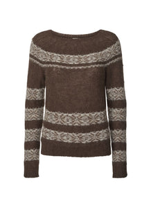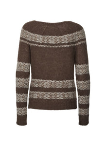 Lillie is a tight fitting knit featuring long raglan sleeves with ribbed trims on the sleeves and bottom. Lillie has a boatneck and a reversed pattern.