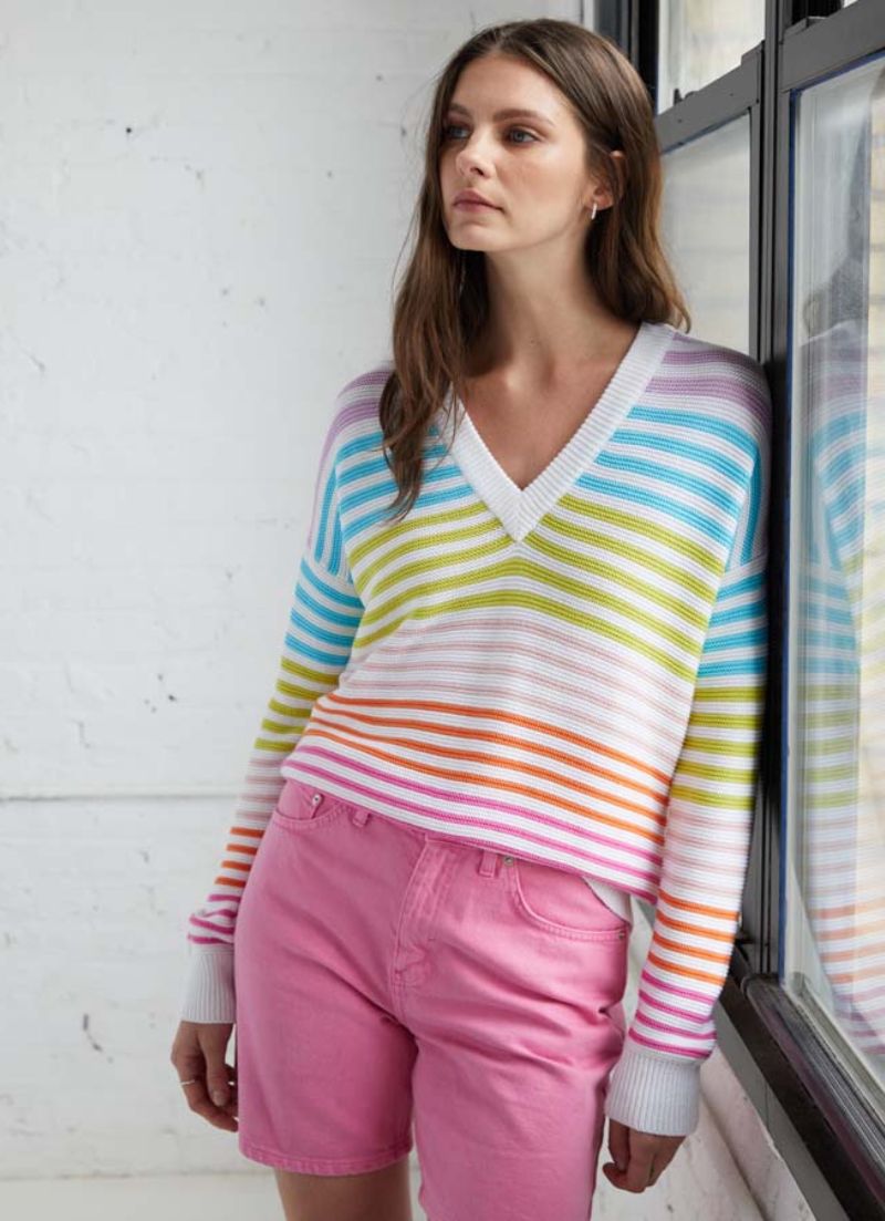 The Linx Seater features a flattering v-neck, long sleeves and colourful stripes all over. It's the perfect luxurious knit to wear this season.