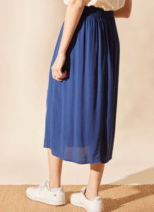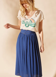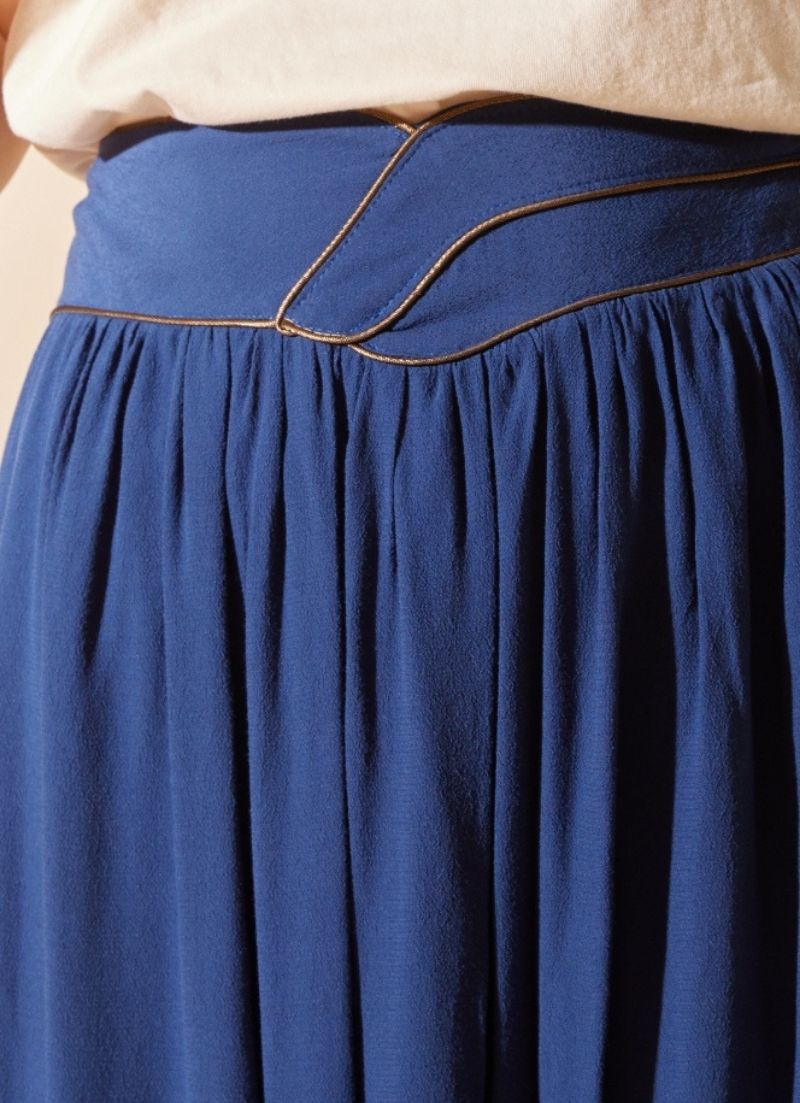 This retro style skirt is fully lined and features a braided gold thread waistband with a stretch panel in the back.