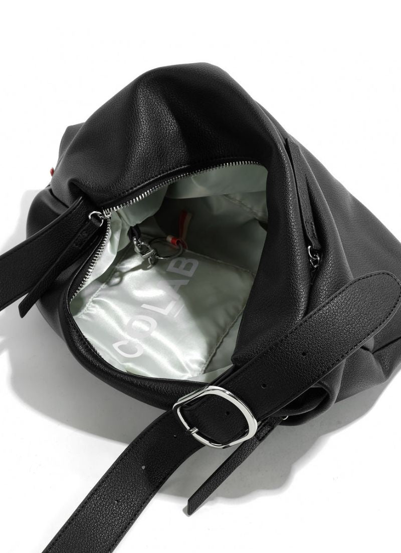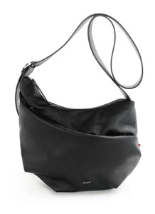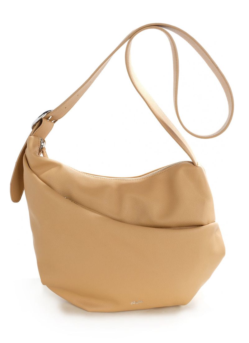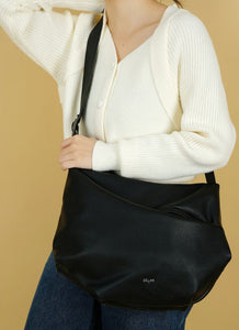 This large holdall hugs the body just right with its curved shape and pleated bottom. Bonus: Front+back zips! This understated design is versatile and roomy, with the added feature of using the flap as a pocket.