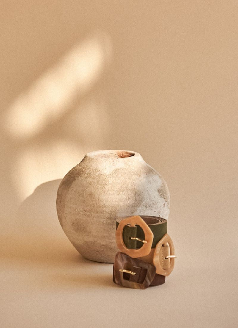 A leather belt featuring a pearly buckle in an irregular hexagonal shape. Wear with dresses, skirts and jumpsuits to define your waist and add a little style!
