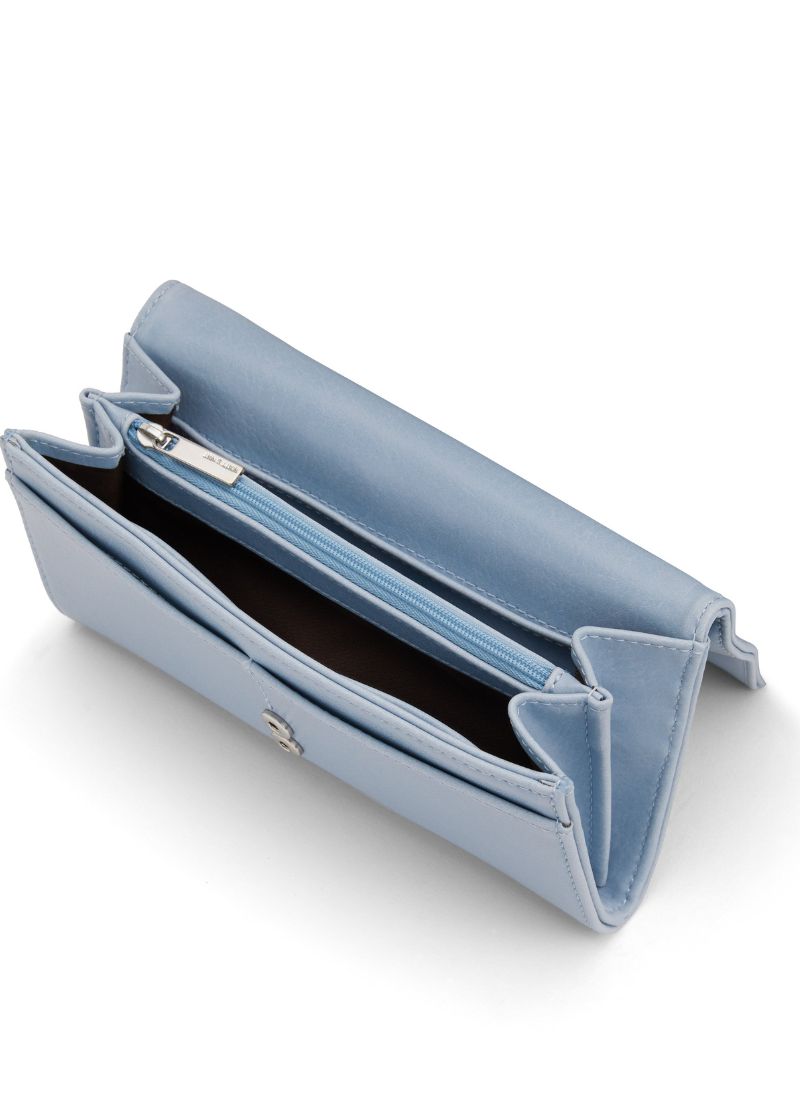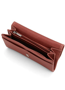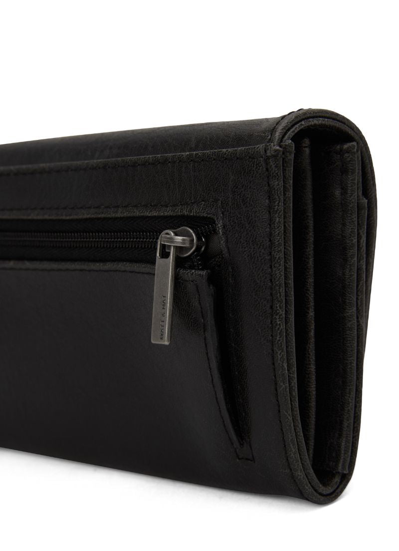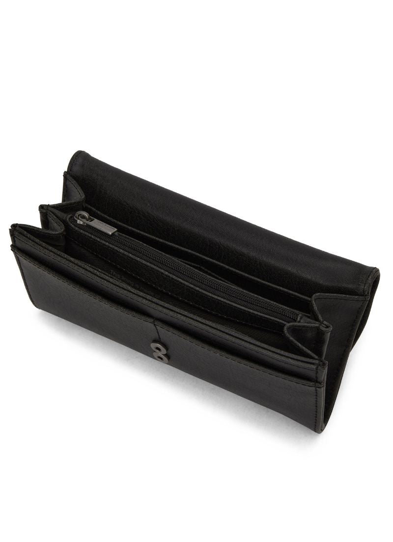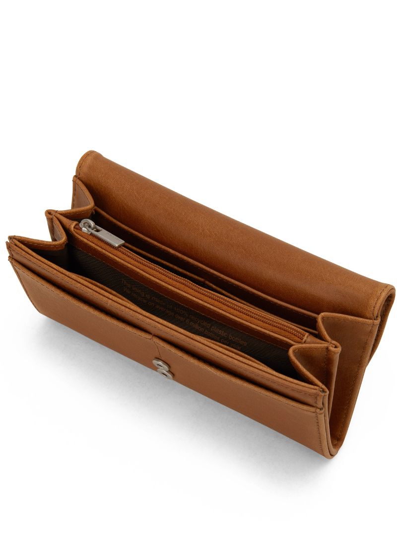Wallet with snap closure and a zipper coin pocket on exterior back. Interior includes 12 credit card slots, 1 slip pocket for bills, and a centre zip compartment.