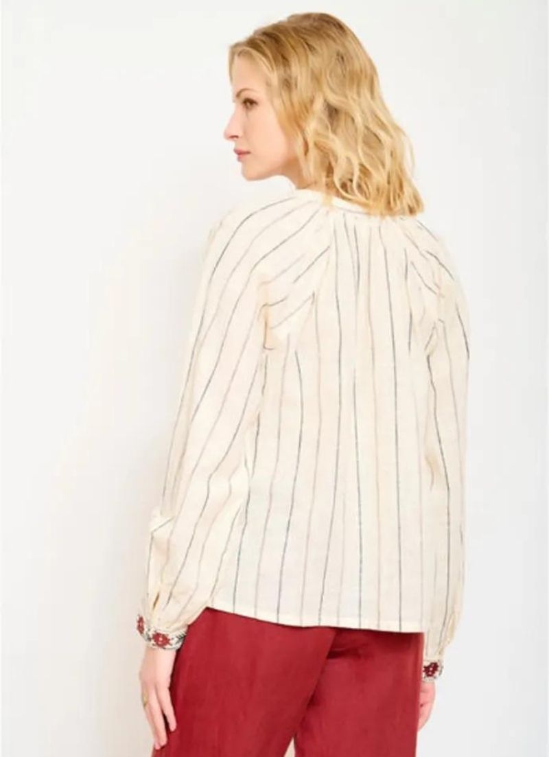 This gypsy folk blouse is features summer stripes and colourful details on a soft cream background.