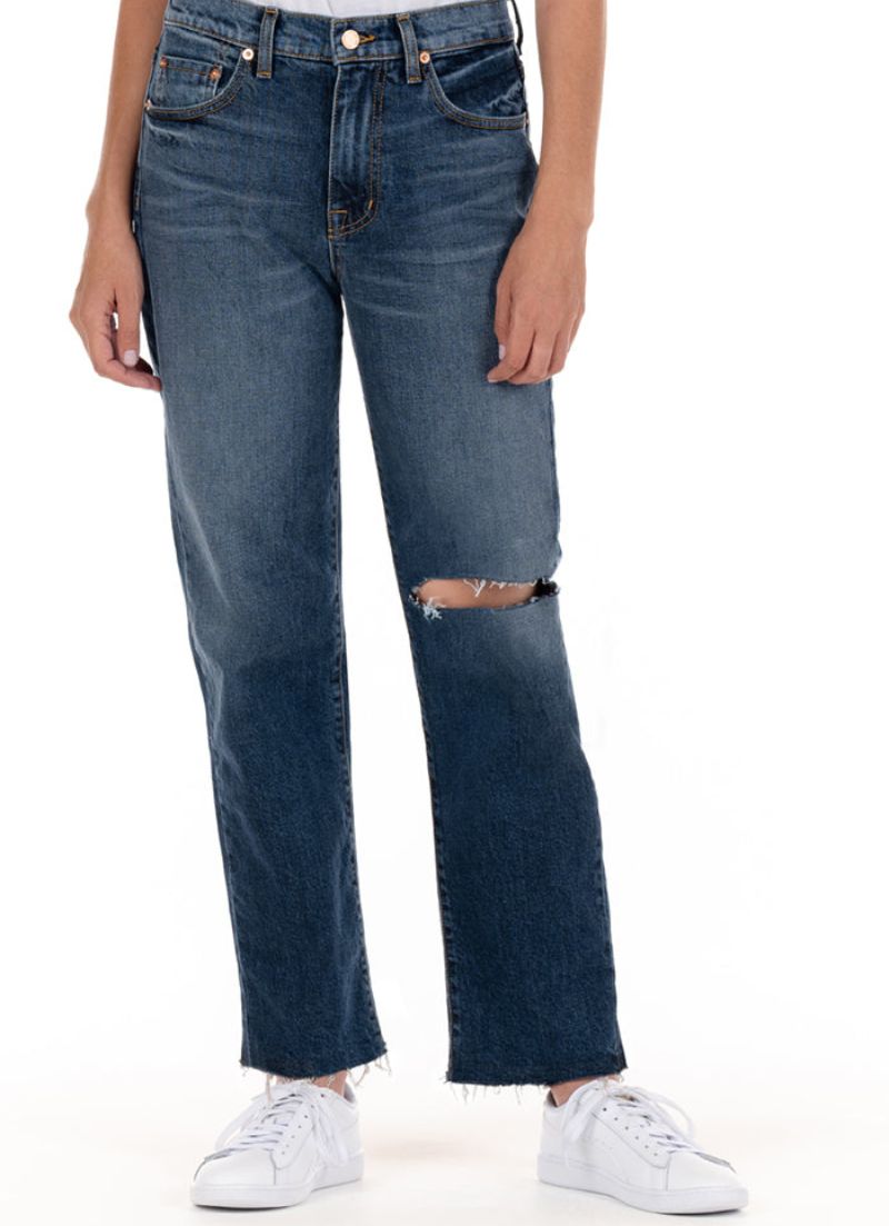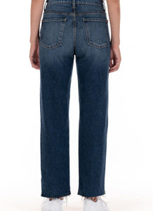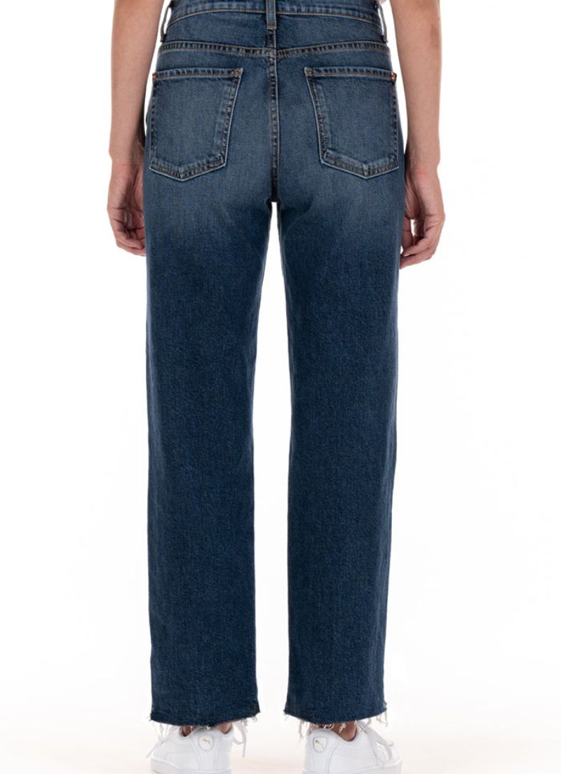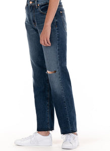 The boyfriend fit of these jeans offers freedom through the legs cropping slightly above the ankle. The unfinished hem and rip at the knee add character and a casual feel to this comfy pair made from our Everly performance stretch fabric.