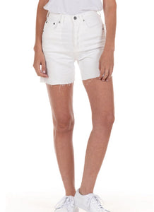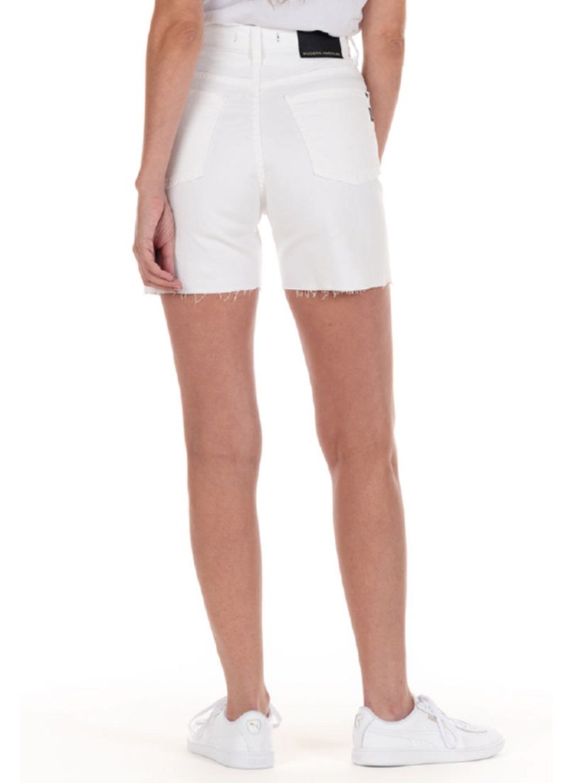 Boyfriend short with a raw hem featuring belt loops and pockets.