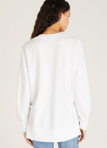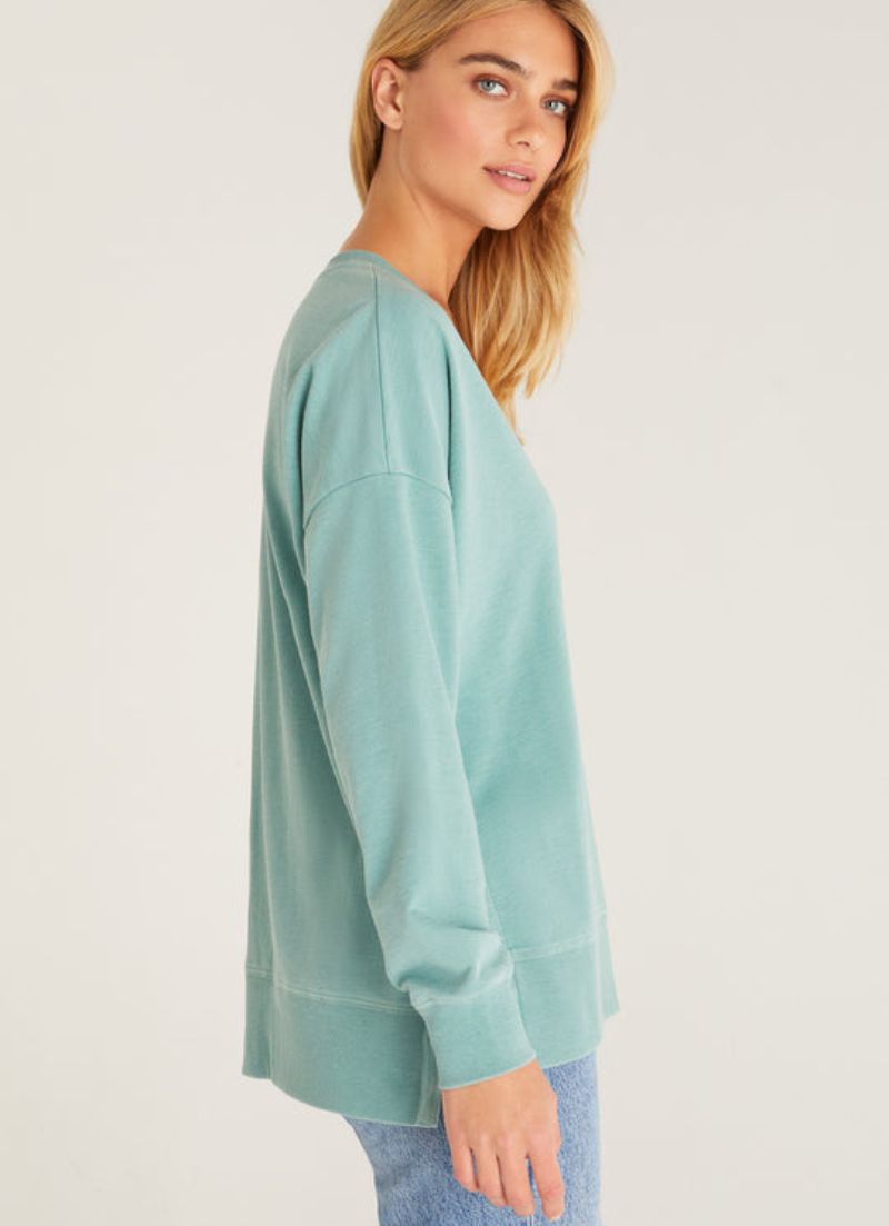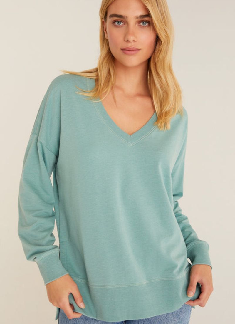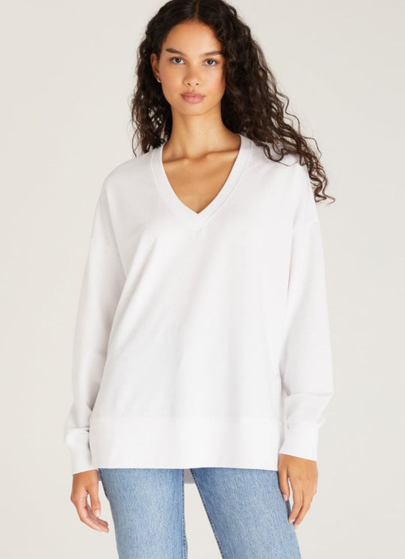 The V-neck Weekender top features a much loved oversized design, a flattering v neckline, with exaggerated side slits and a raw edge hem with ribbed accents.