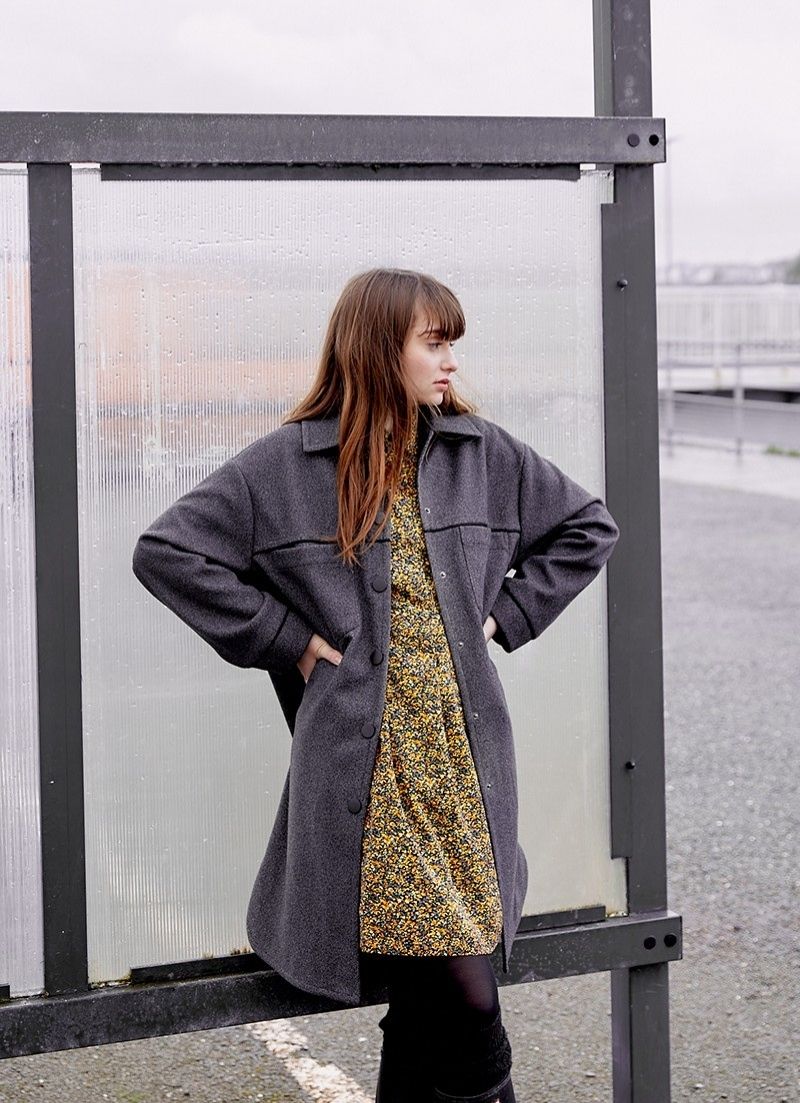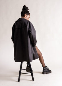 This long length shacket will keep you warm and stylish in all seasons. The big sleek buttons and black piping along the bust and cuff lend a modern 60's mod influence. It has snap button closure and pockets on the chest.