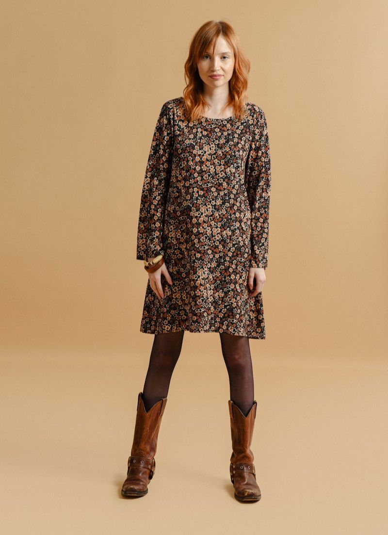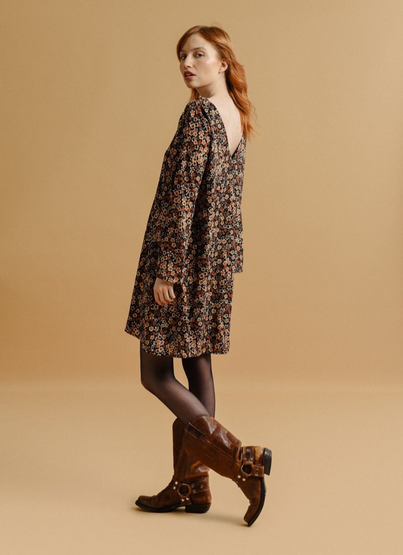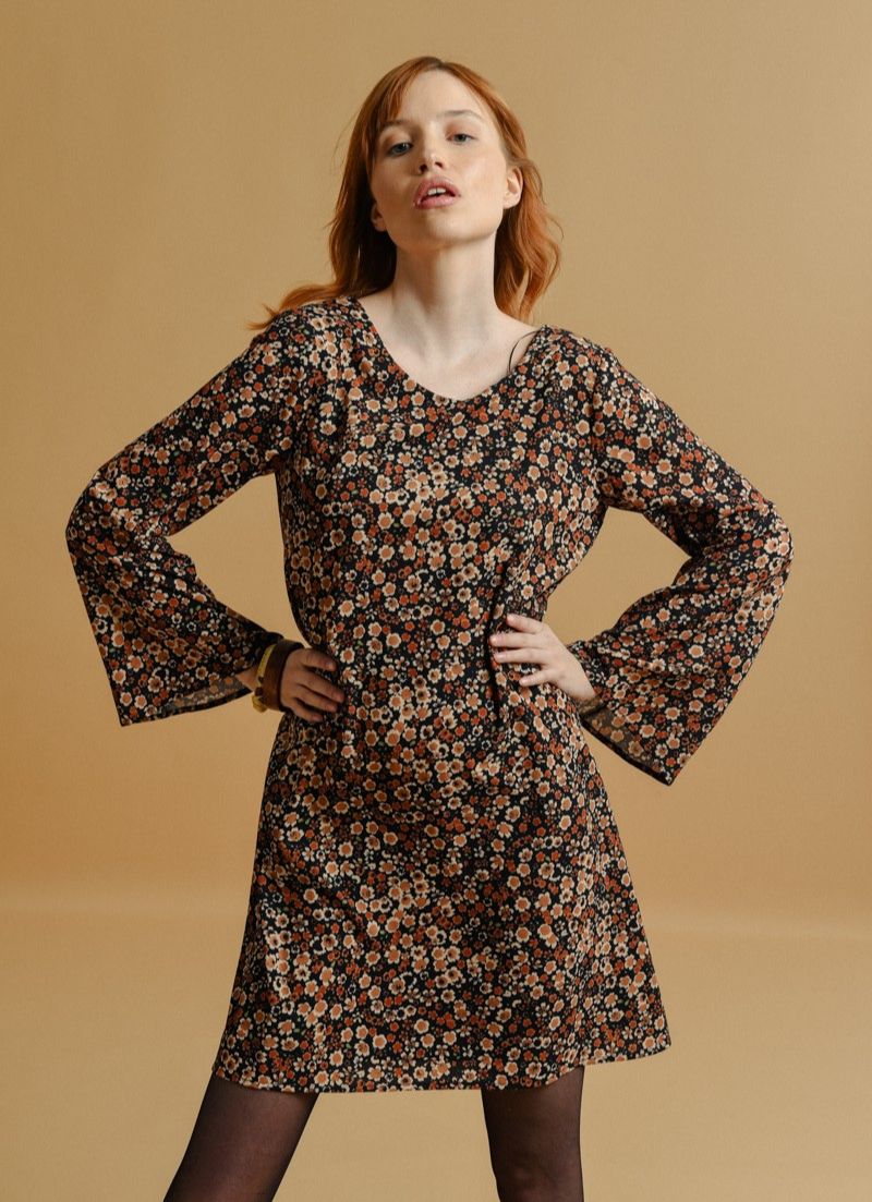 A flared silhouette mini dress, featuring a back deep v-neckline, long bell sleeves and an allover floral print.