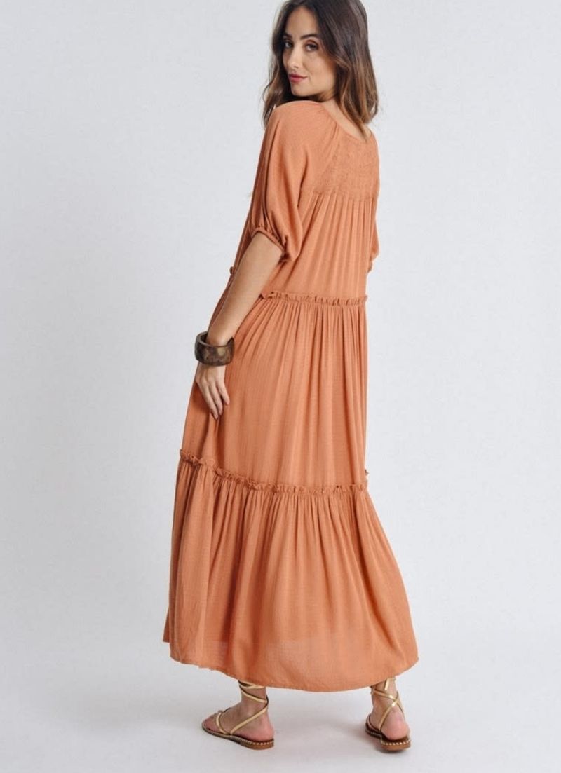 This retro bohemian silhouette dress features sort balloon sleeves and v-neckline with cord and tassels to accentuate the style.