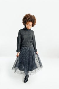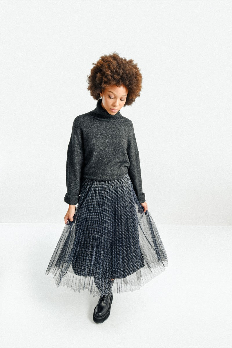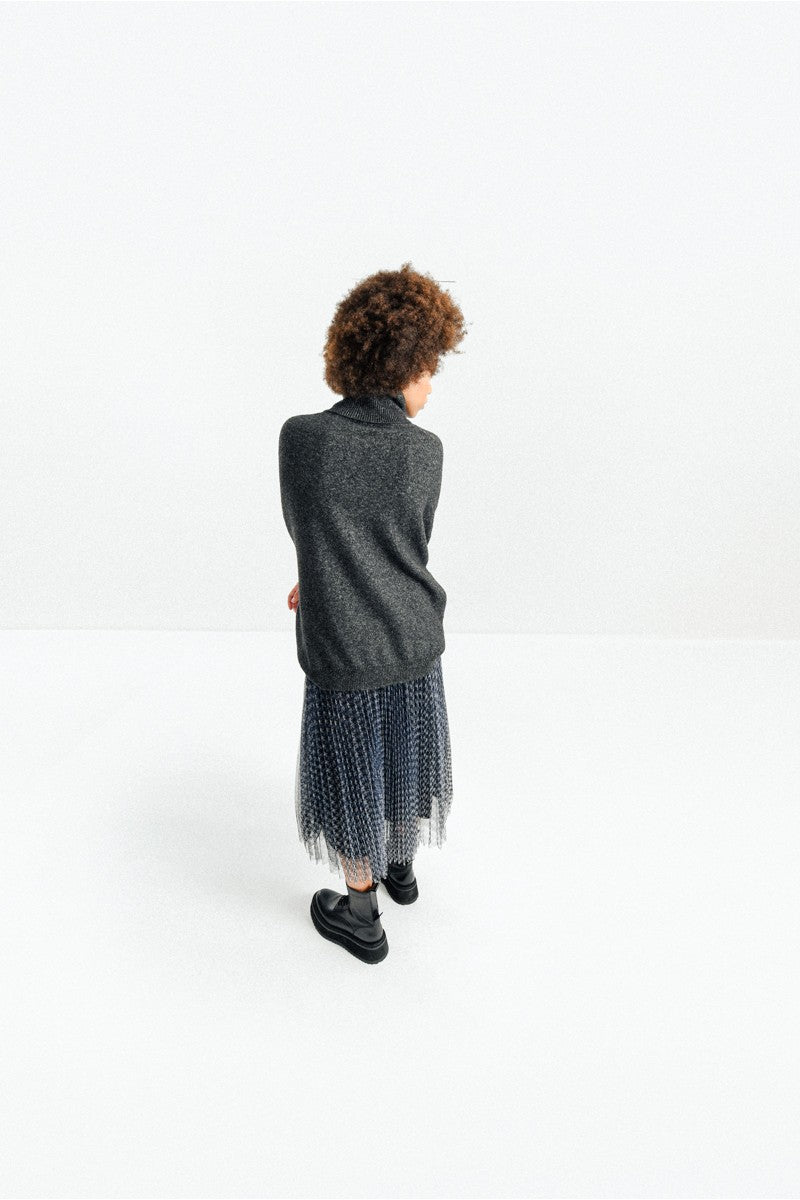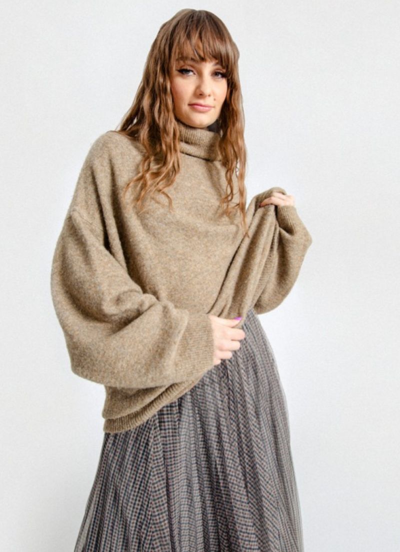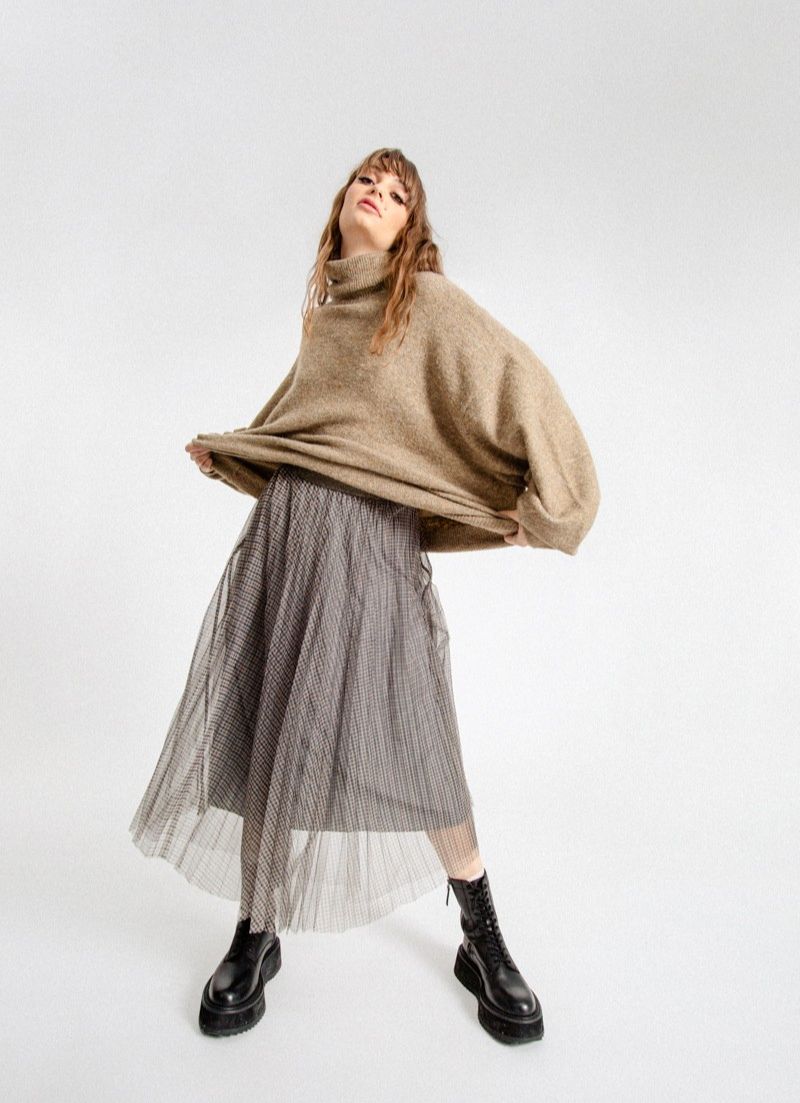 This sweater features an oversize silhouette, soft knit, turtleneck and drop shoulders.