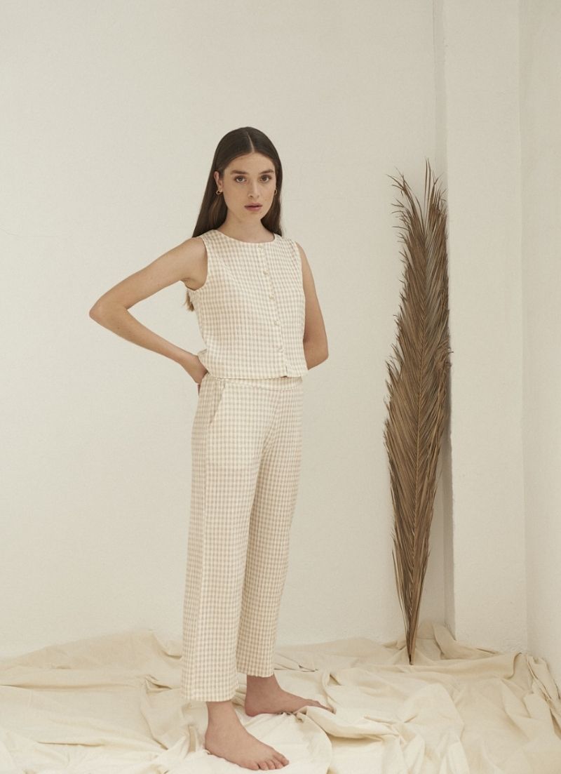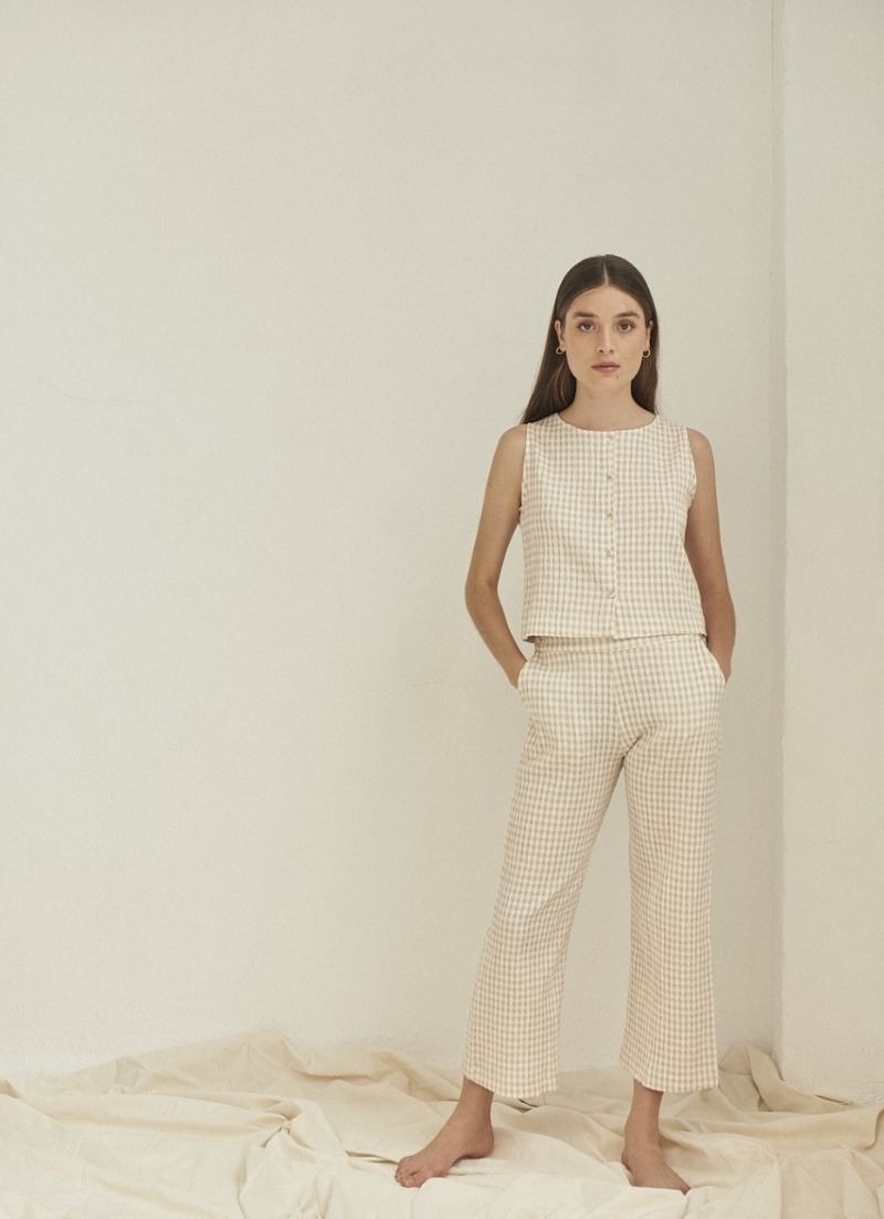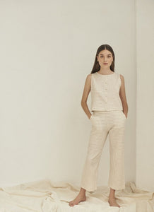Flare style pants featuring side pockets, a flat front waistband and an elastic back waistband for fit.