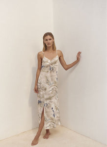 This printed lingerie dress features a V-neckline and ruching at the chest.